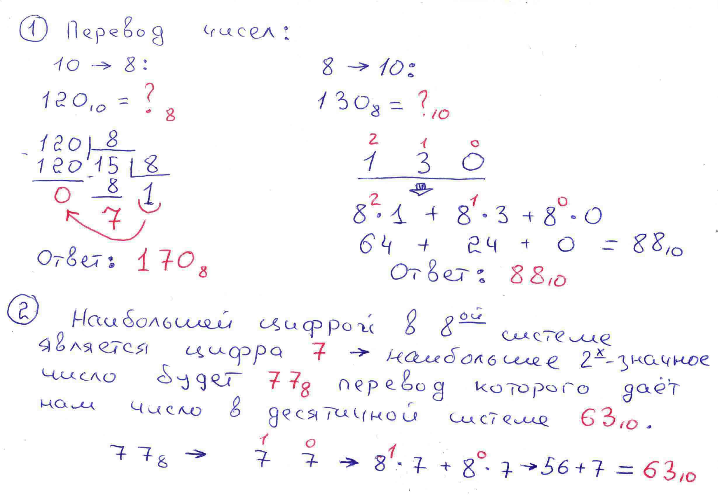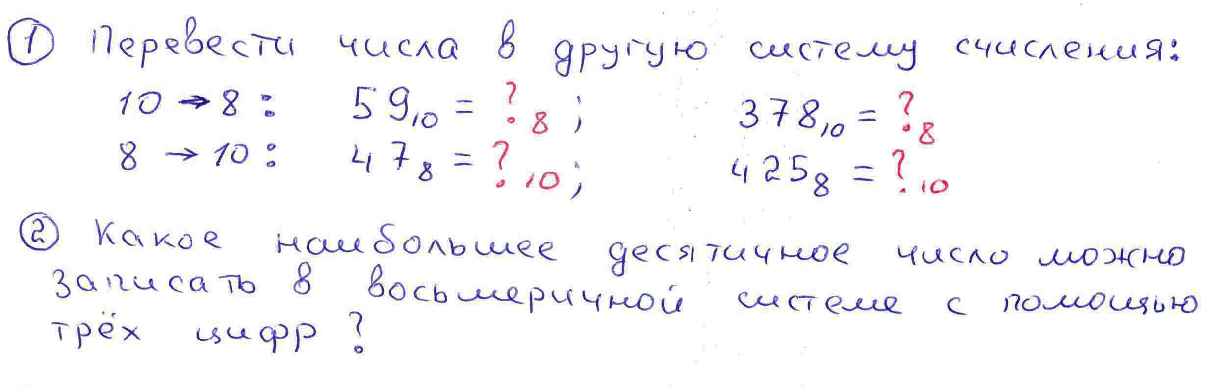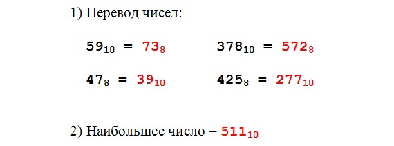 Текст задания1. Переведите числа из десятичной системы в восьмеричную и из восьмеричной в десятичную. 2. Какое наибольшее число можно записать с помощью трёх цифр восьмеричной системы счисления? |