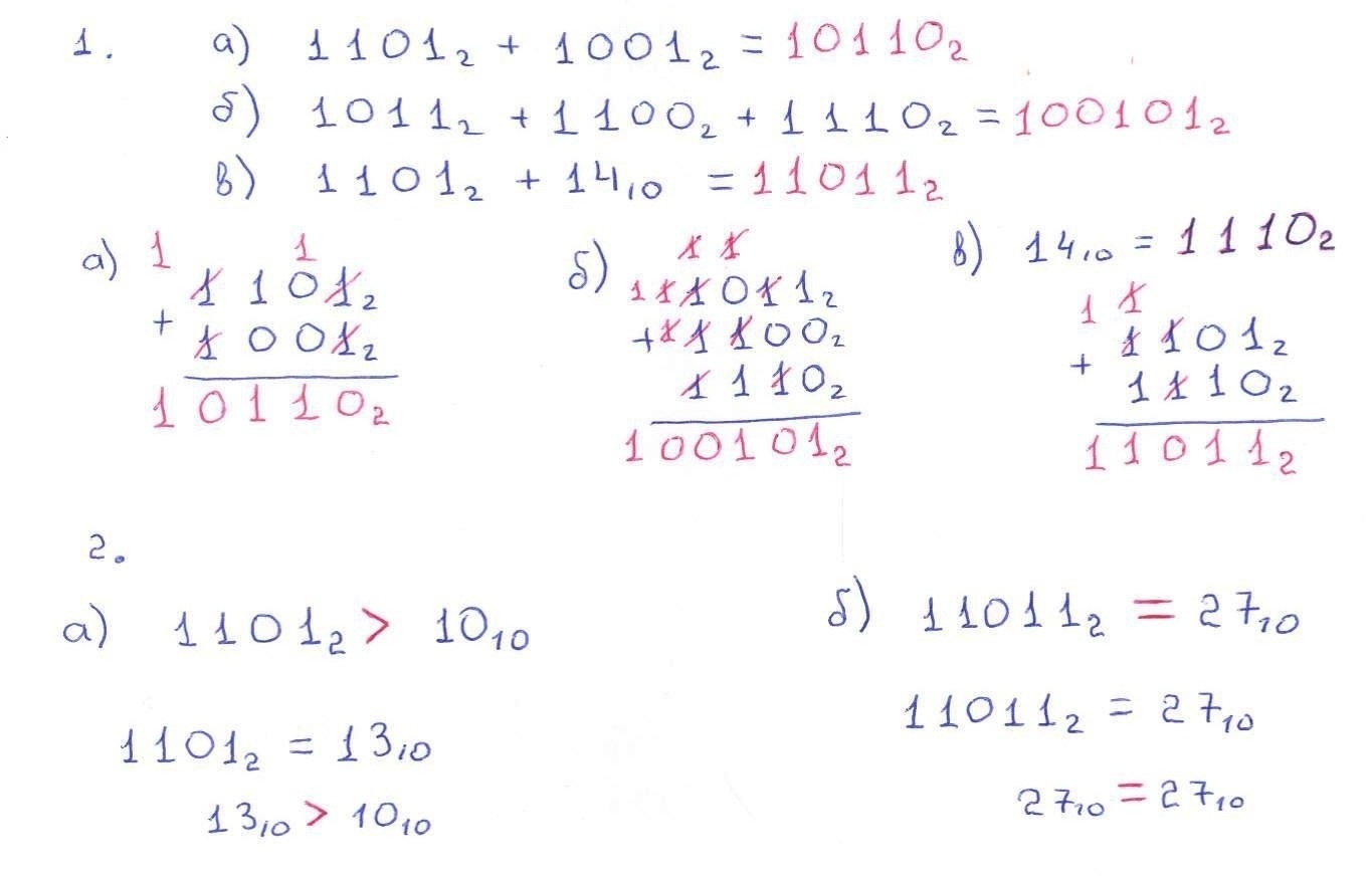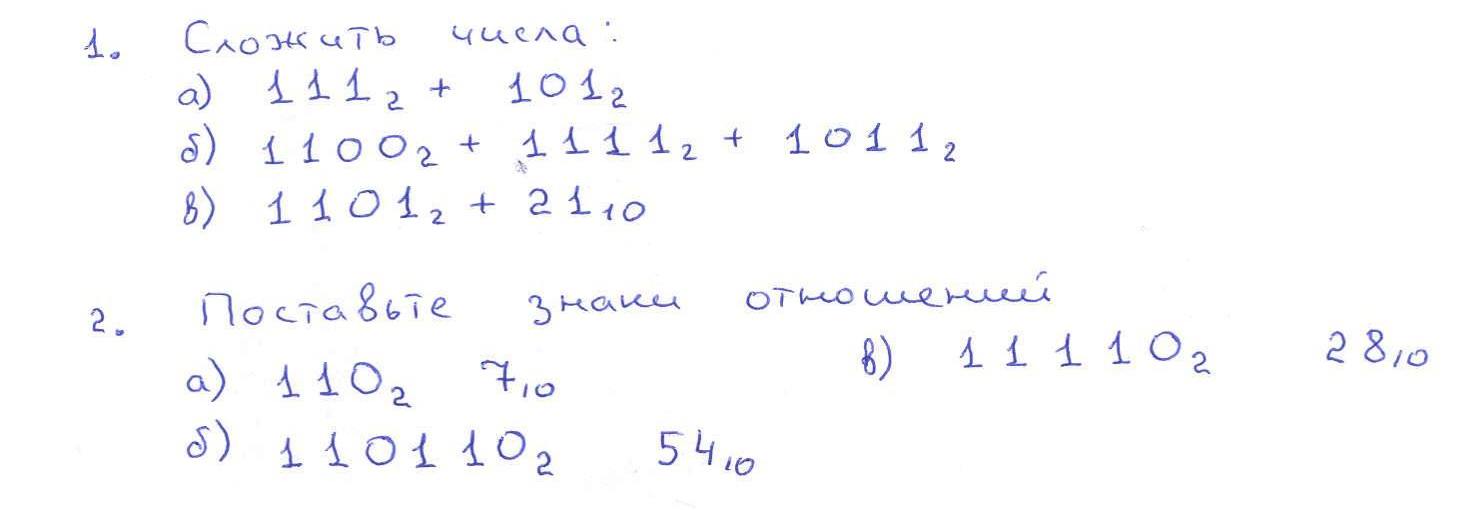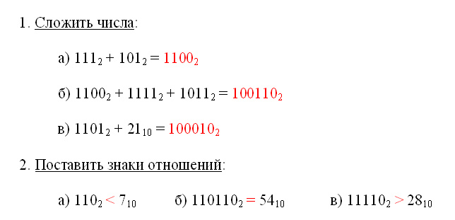 Текст задания1. Сложить числа (ответ в двоичной системе). 2. Расставить знаки отношений. Видеоурок для выполнения данного задания.
