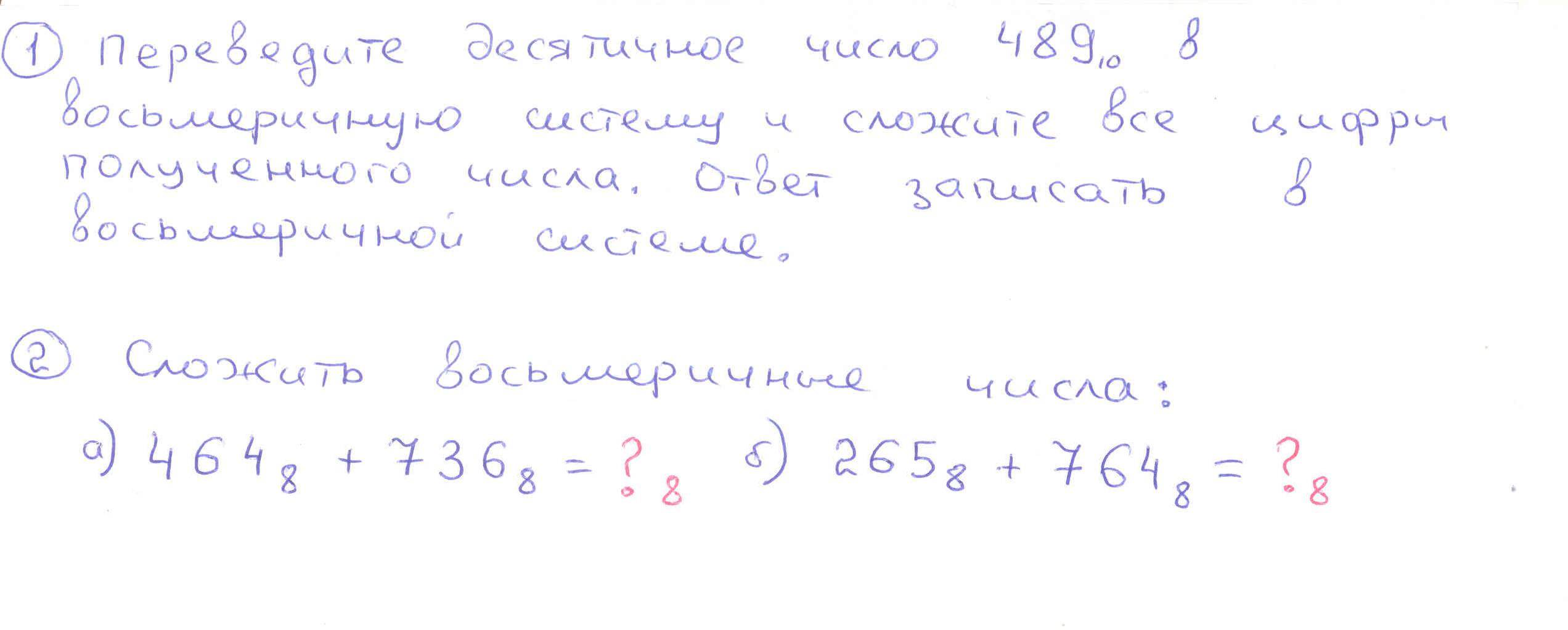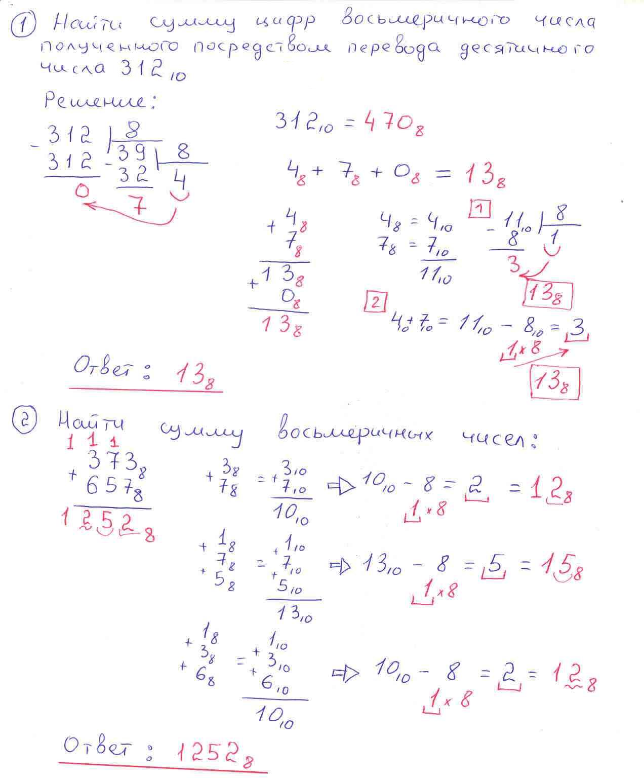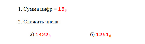 Текст задания1. Найти сумму цифр восьмеричного числа полученного посредством перевода десятичного числа. Ответ записать в восьмеричной системе. 2. Найти сумму восьмеричных чисел. |