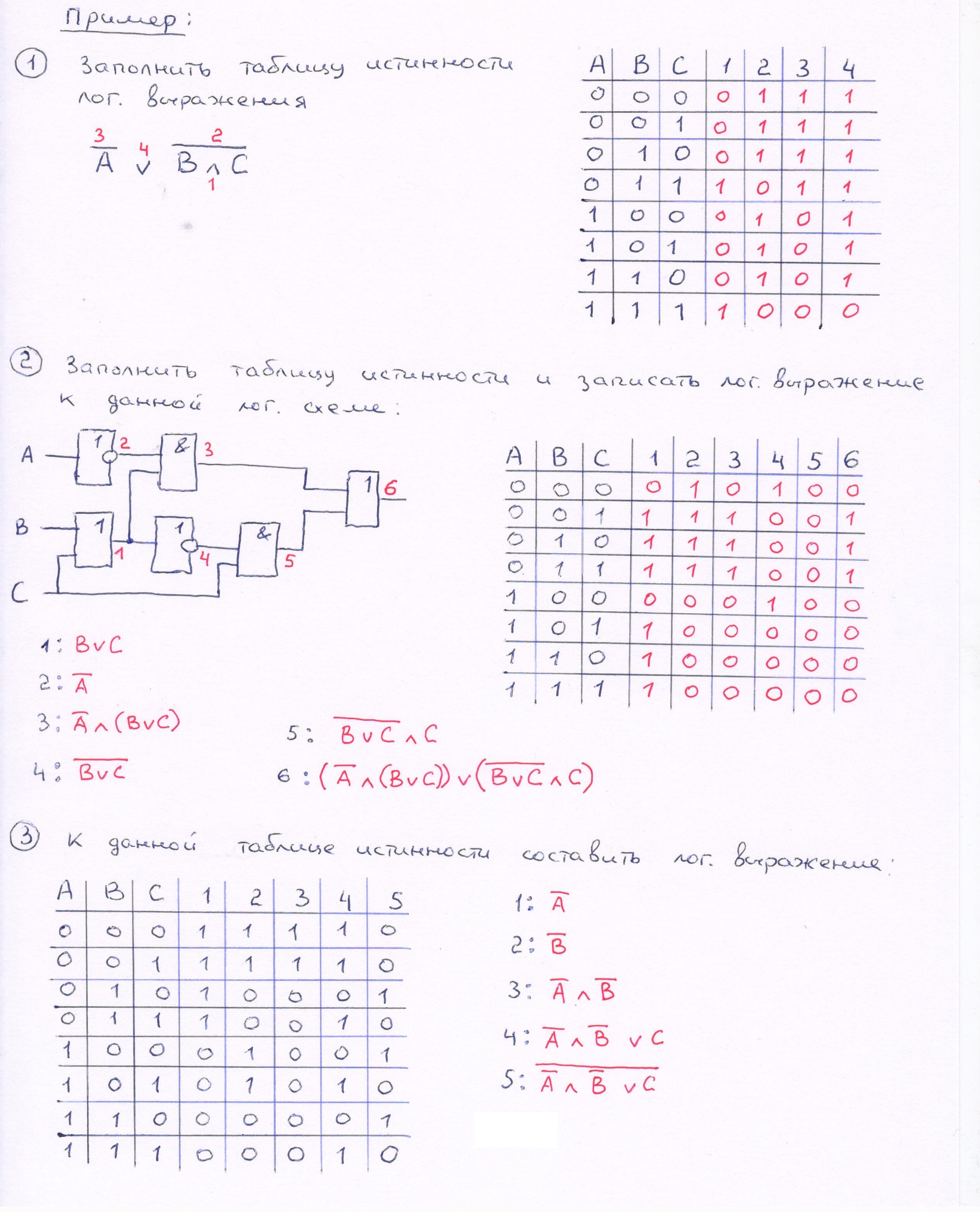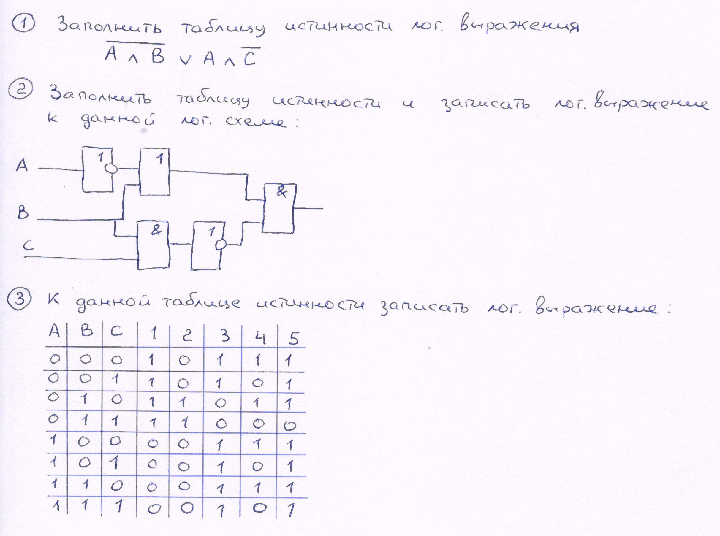 Текст задания1. Заполнить таблицу истинности логического выражения. 2. Заполнить таблицу истинности и записать логическое выражение к данной логической схеме. 3. К данной таблице истинности составить логическое выражение. |