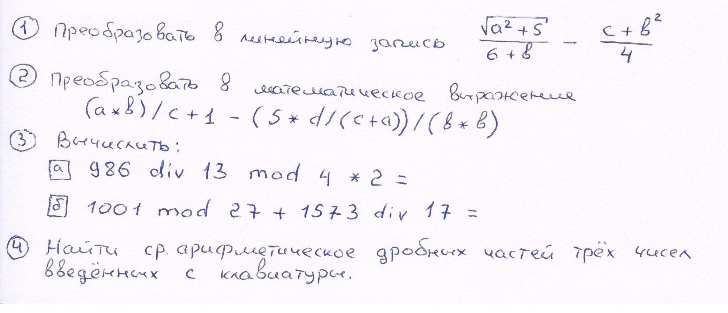 Текст задания1. Преобразовать в линейную запись. 2. Преобразовать в математическое выражение. 3. Вычислить. 4. Написать программу. |