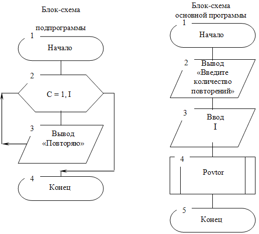 Как видно из примера, имя функции выступает как бы в роли переменной логического типа, поэтому ей надо присваивать какое-то значение. Оно выступает в роли переменной, к которой присваивается какое-то значение, но оно не может участвовать в «правых» частях выражений. В блок-схеме алгоритма вызов подпрограммы или функции обозначается значком: Пример блок-схемы с использованием подпрограммы: