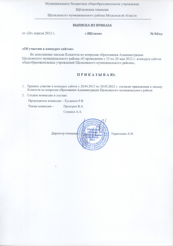 Приказ №84/од «Об участии в конкурсе сайтов» |