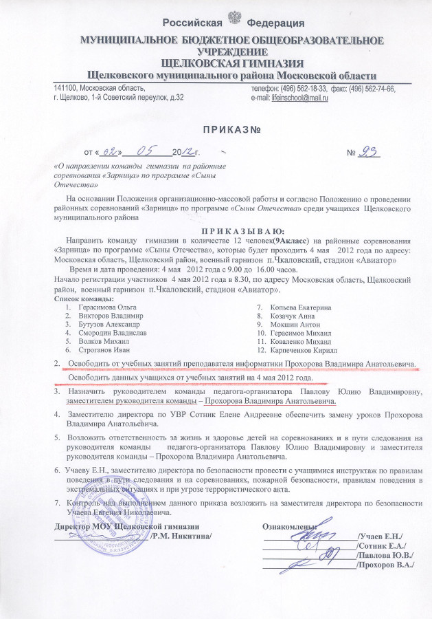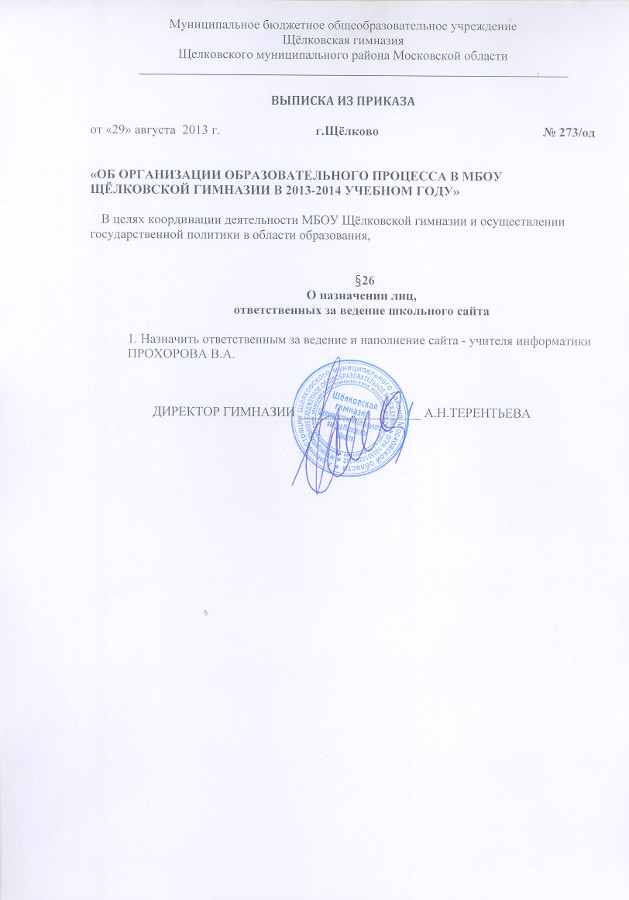 Приказ №273/од «Об организации образовательного процесса в МБОУ Щёлковской гимназии в 2013-2014 учебном году», о назначении лиц, ответственных за ведение школьного сайта |