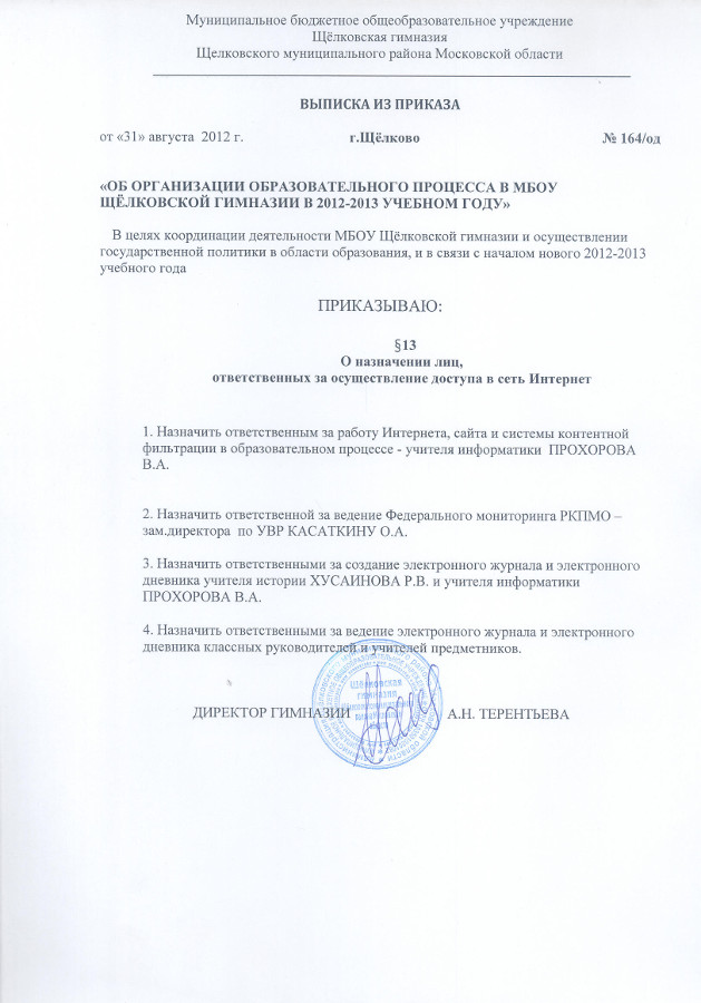 Приказ №164/од «Об организации образовательного процесса в МБОУ Щёлковской гимназии в 2012-2013 учебном году», о назначении лиц, ответственных за осуществление доступа в сеть Интернет |