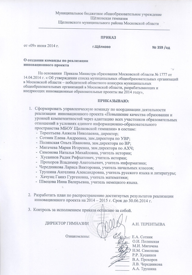 Приказ №359/од «О создании команды по реализации инновационного проекта» |