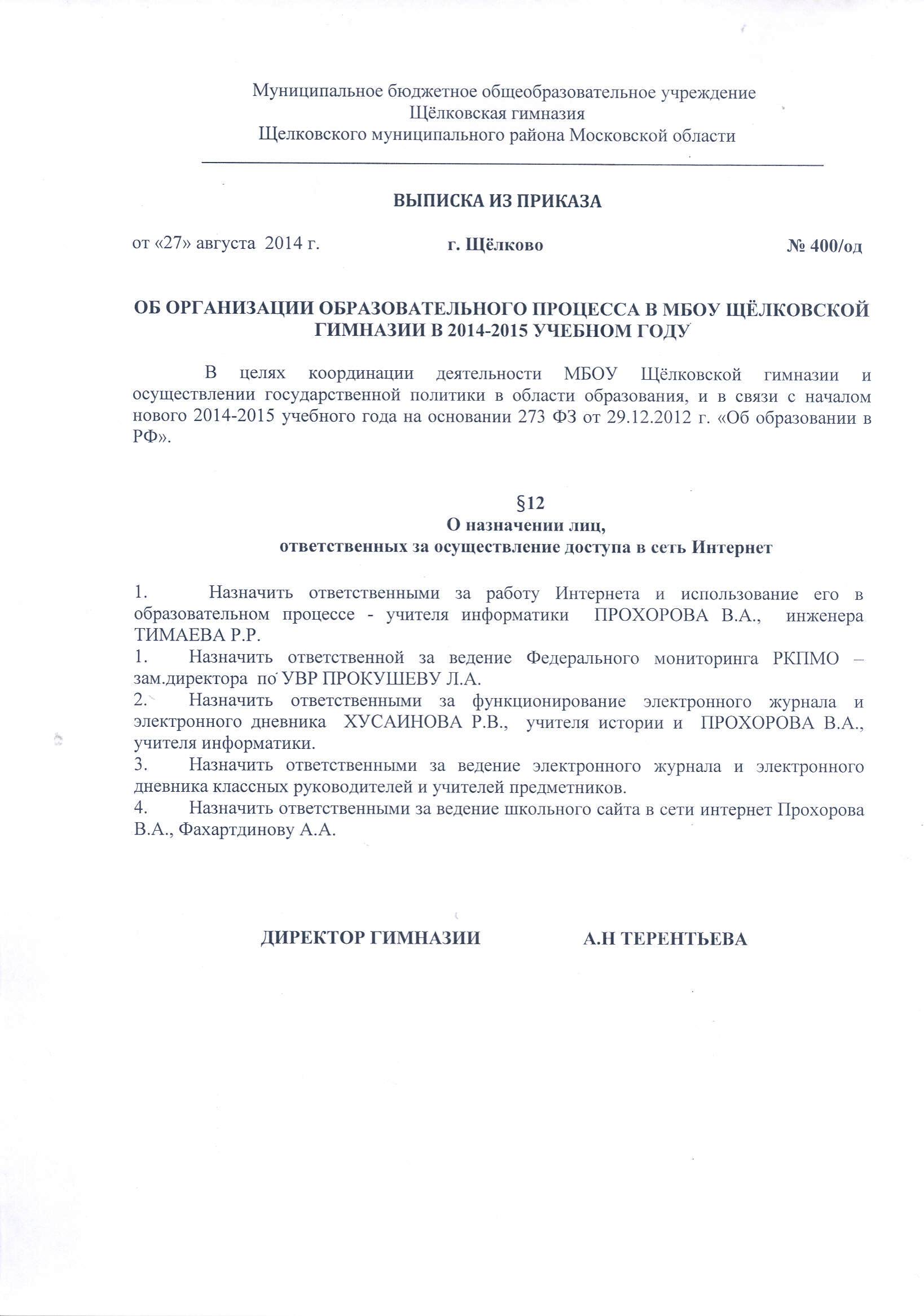 Приказ №400/од «Об организации образовательного процесса в МБОУ Щёлковской гимназии в 2014-2015 учебном году», о назначении лиц, ответственных за осуществление доступа в сеть Интернет |