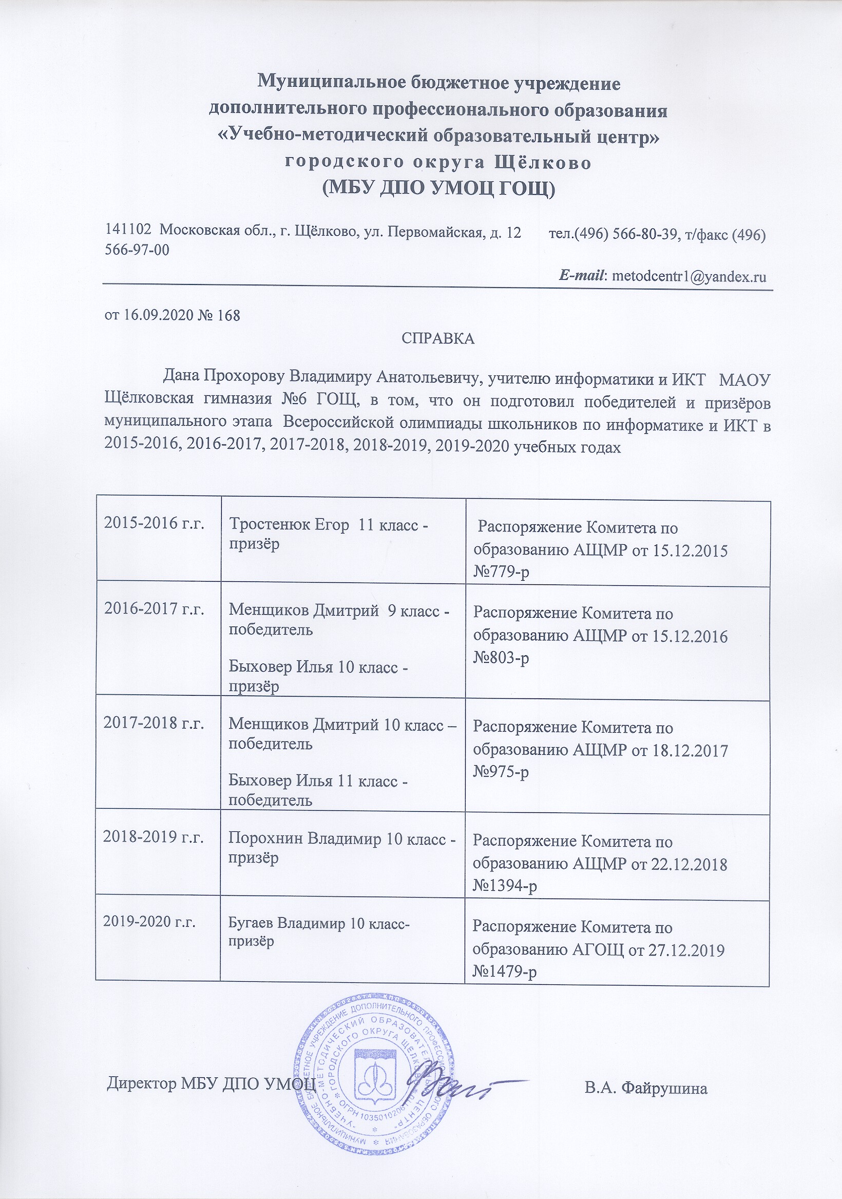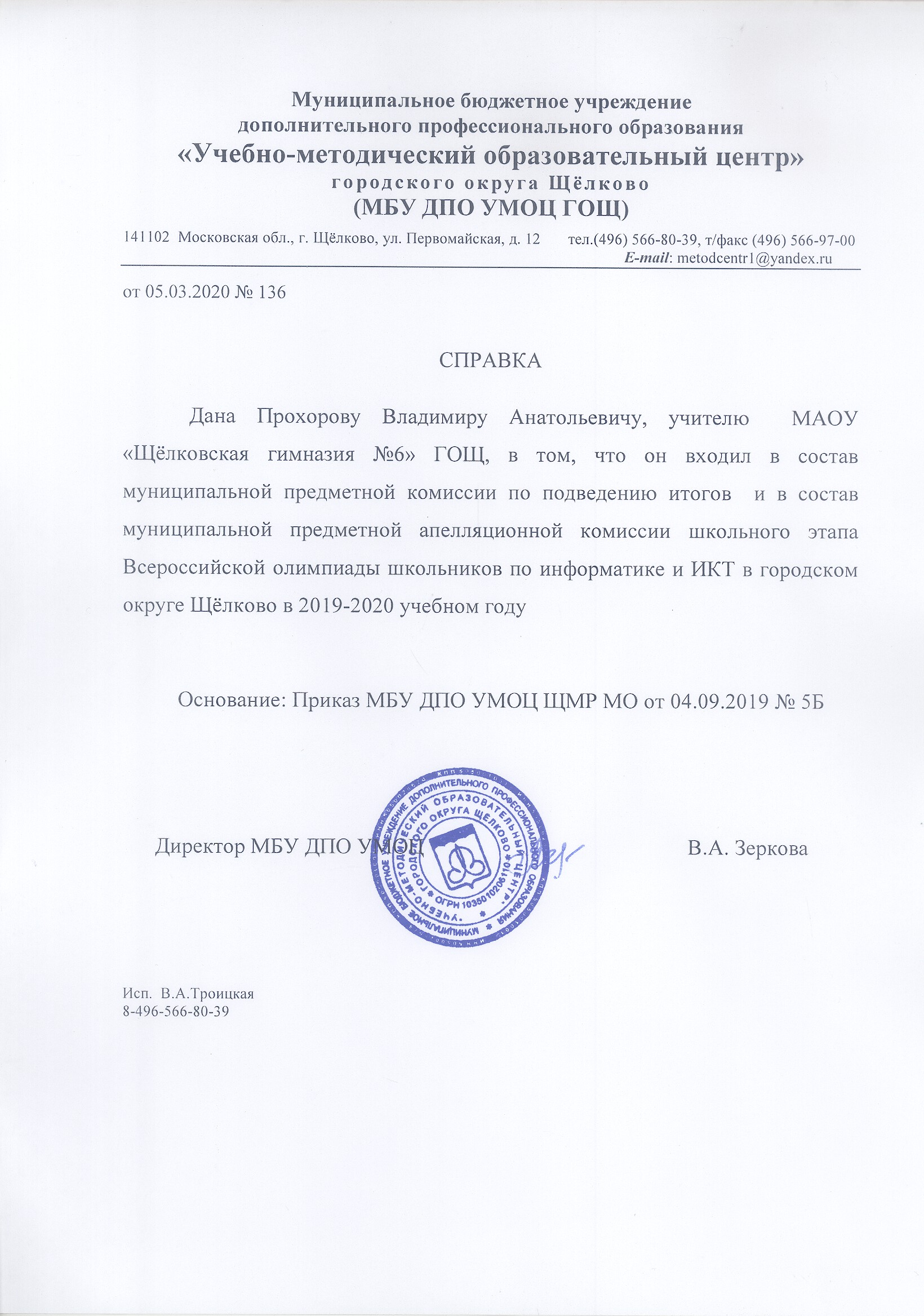 Справка №136 «О вхождении в состав муниципальной предметной комиссии по подведению итогов и в состав муниципальной предметной аппеляционной комиссии школьного этапа Всероссийской олимпиады школьников по информатике и ИКТ в городском округе Щёлково в 2019-2020 учебном году» |
