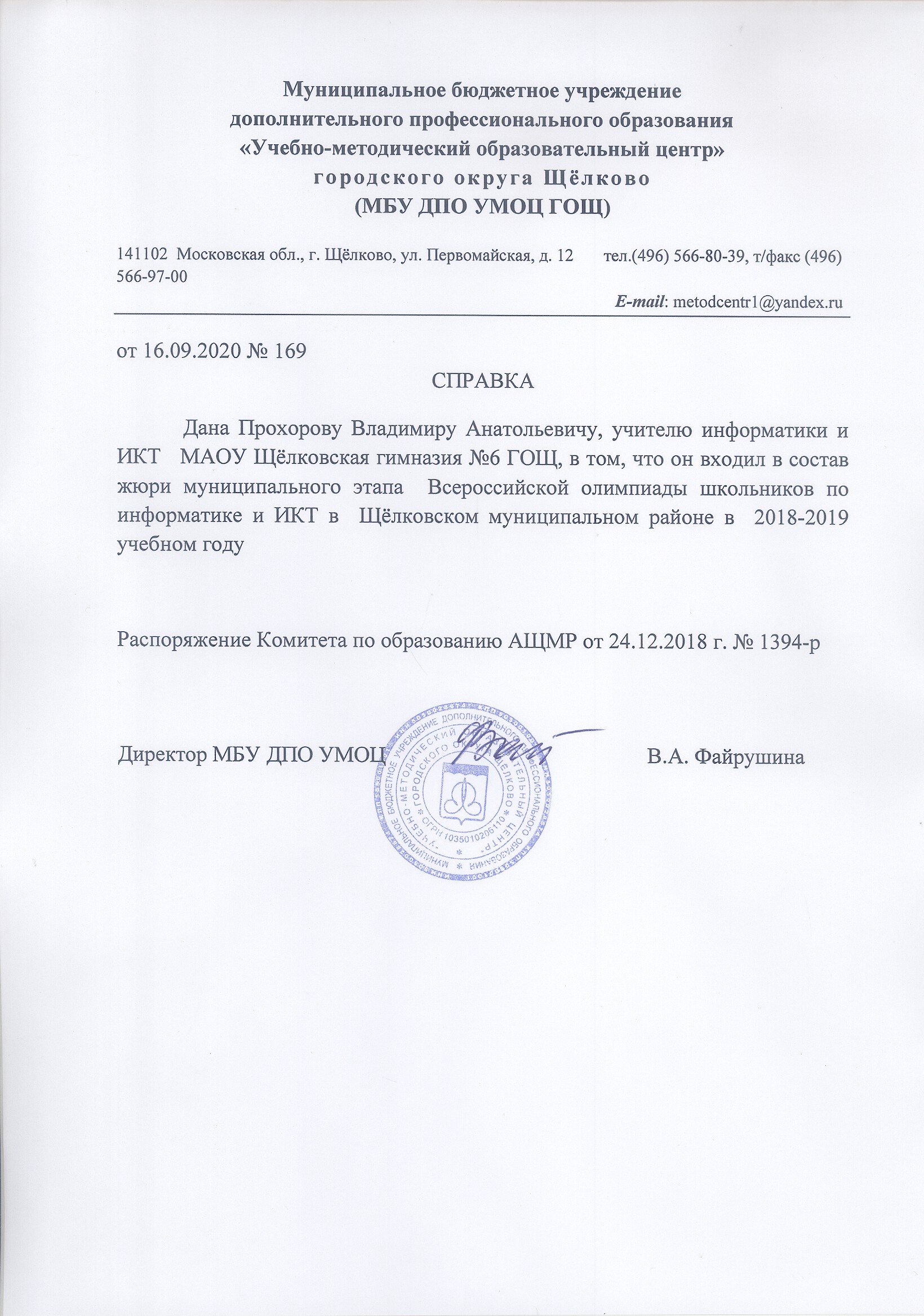 Справка №169 «О вхождении в состав жюри муниципального этапа Всероссийской олимпиады школьников по информатике и ИКТ в Щёлковском муниципальном районе в 2018-2019 учебном году» |