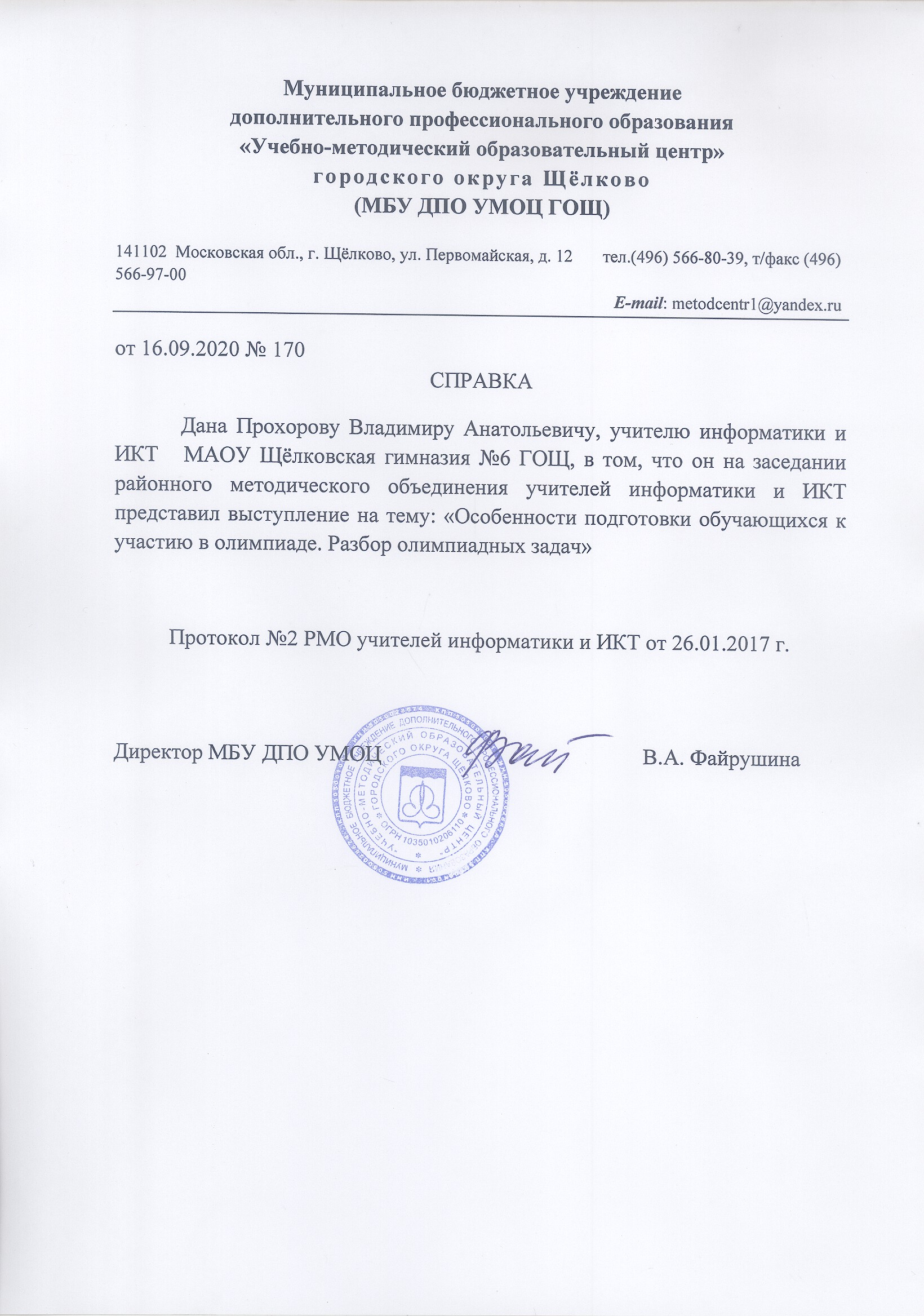 Справка №170 «О выступлении на заседании районного методического объединения учителей информатики и ИКТ на тему: Особенности подготовки обучающихся к участию в олимпиаде. Разбор олимпиадных задач.» |
