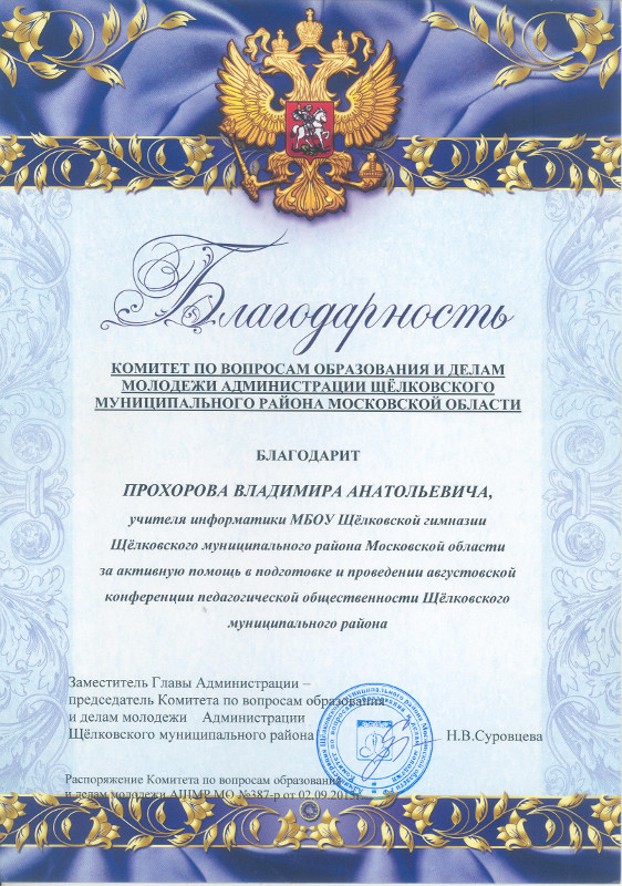Благодарность Комитета по вопросам образования и делам молодёжи АЩМР МО за активную помощь в подготовке и проведении августовской конференции педагогической общественности Щёлковского муниципального района |