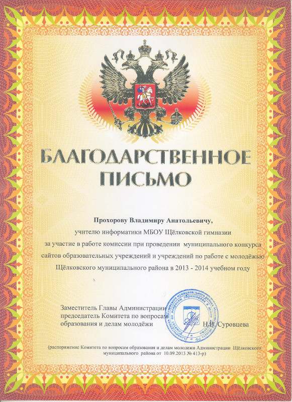 Благодарственное письмо Комитета по вопросам образования и делам молодёжи АЩМР МО за участие в работе комиссии при проведении муниципального конкурса сайтов образовательных учреждений и учреждений по работе с молодёжью ЩМР в 2013-2014 учебном году |