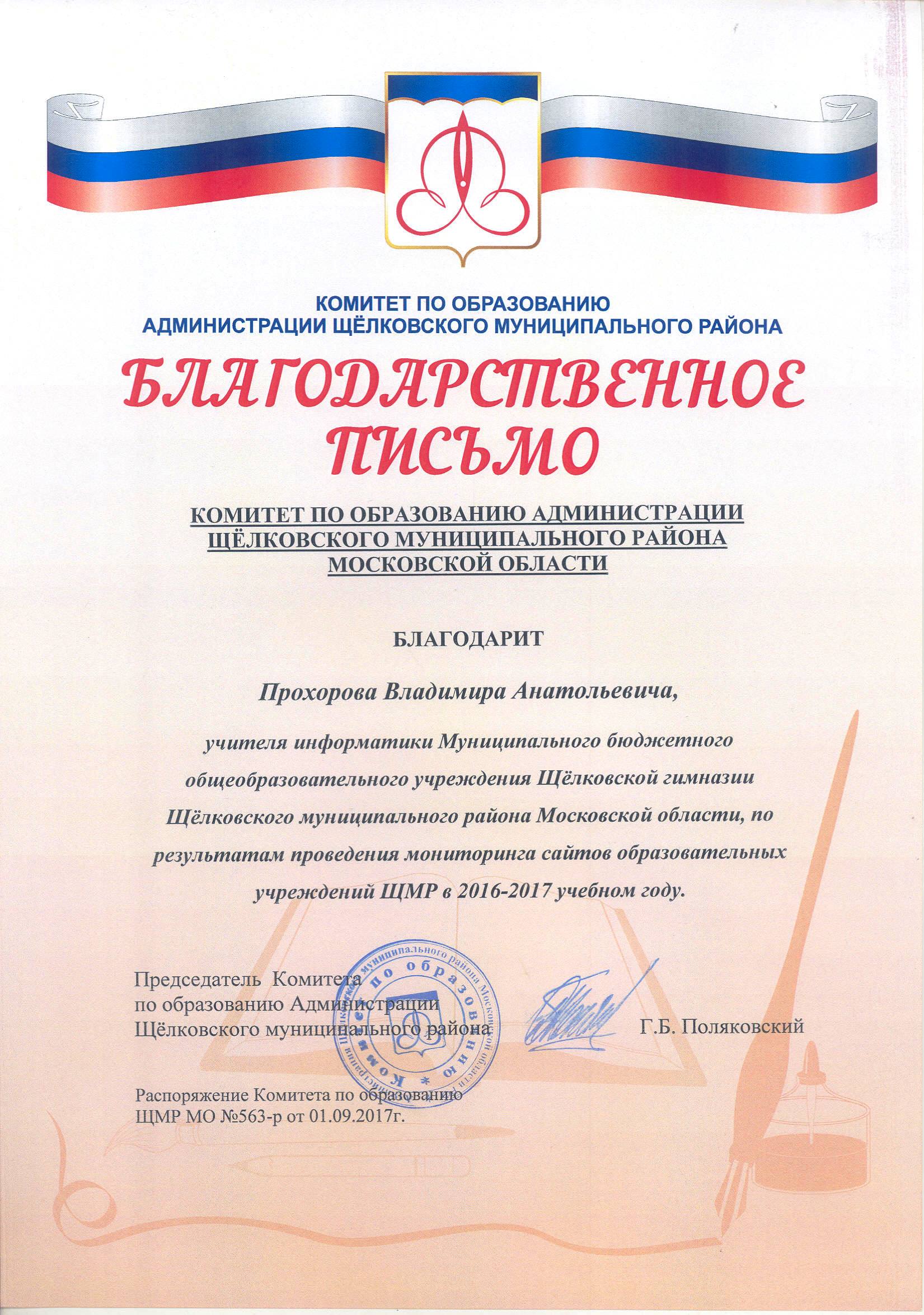 Благодарственное письмо Комитета по образованию Администрации ЩМР МО по результатам проведения мониторинга сайтов образовательных учреждений ЩМР в 2016-2017 учебном году |