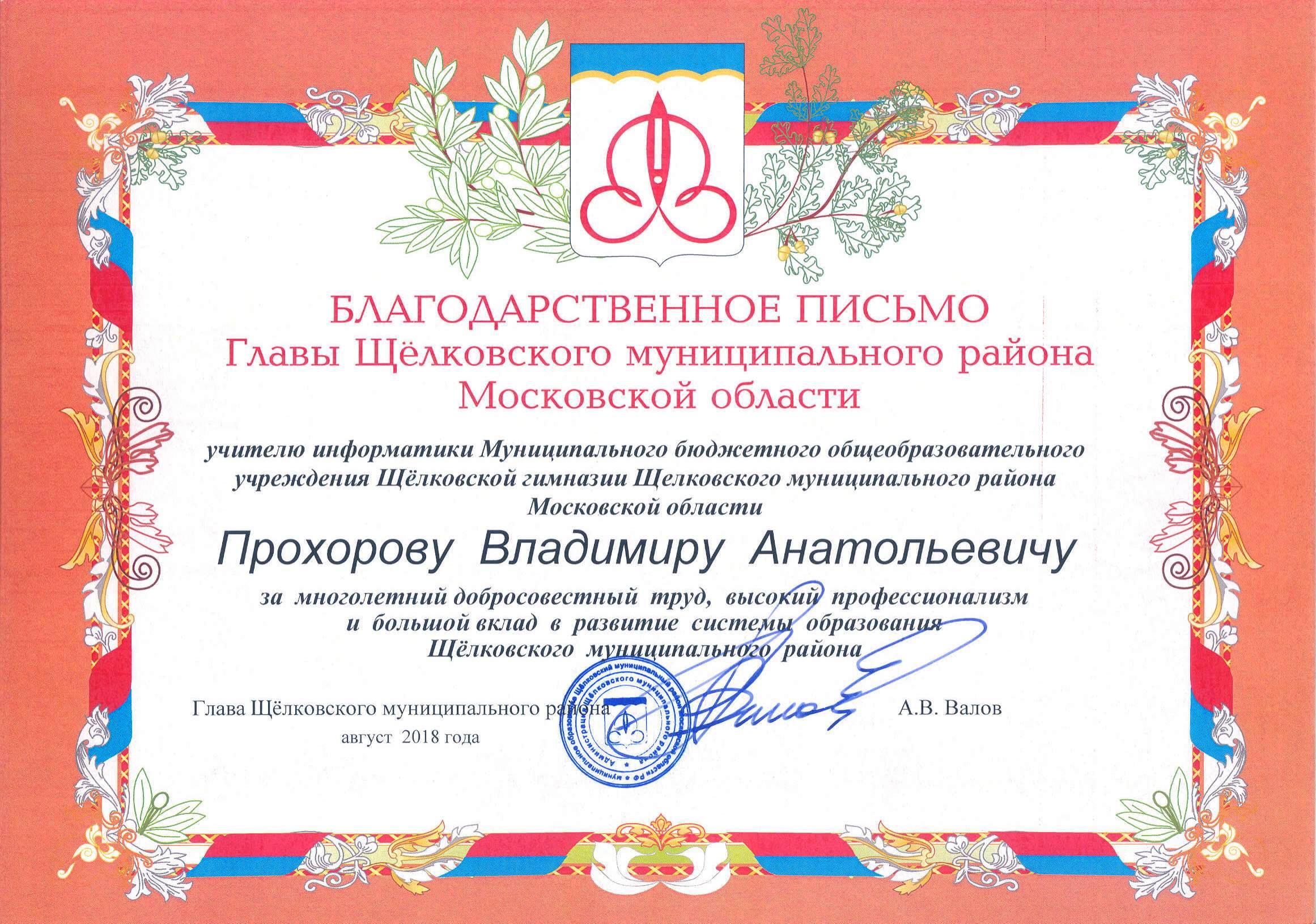 Благодарственное письмо Главы Щёлковского муниципального района Московской области за многолетний добросовестный труд, высокий профессионализм и большой вклад в развитие системы образования Щёлковского муниципального района |