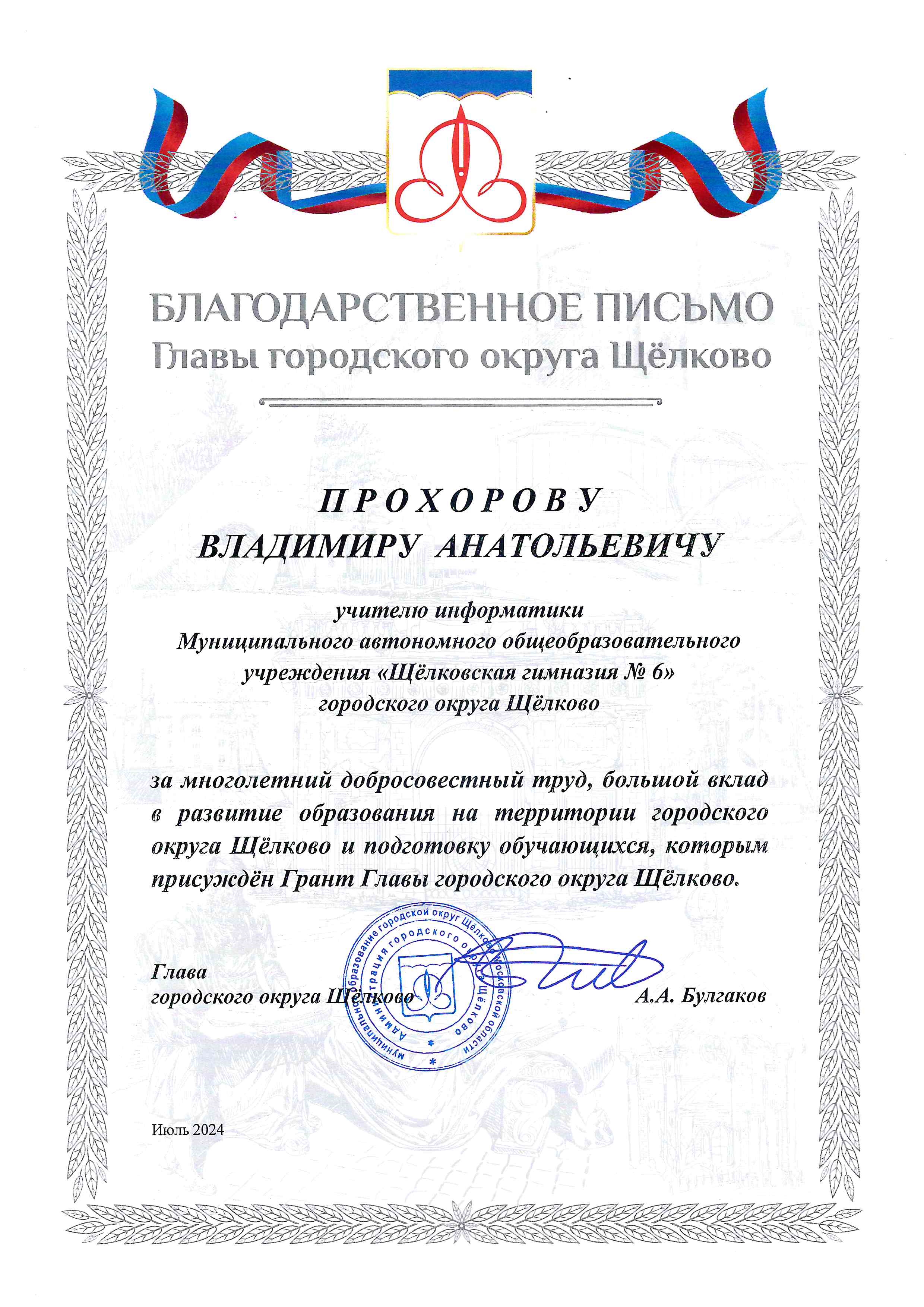 Благодарственное письмо Главы городского округа Щёлково за многолетний добросовестный труд, большой вклад в развитие образования на территории городского округа Щёлково и подготовку учащихся, которым присуждён Грант Главы городского округа Щёлково |