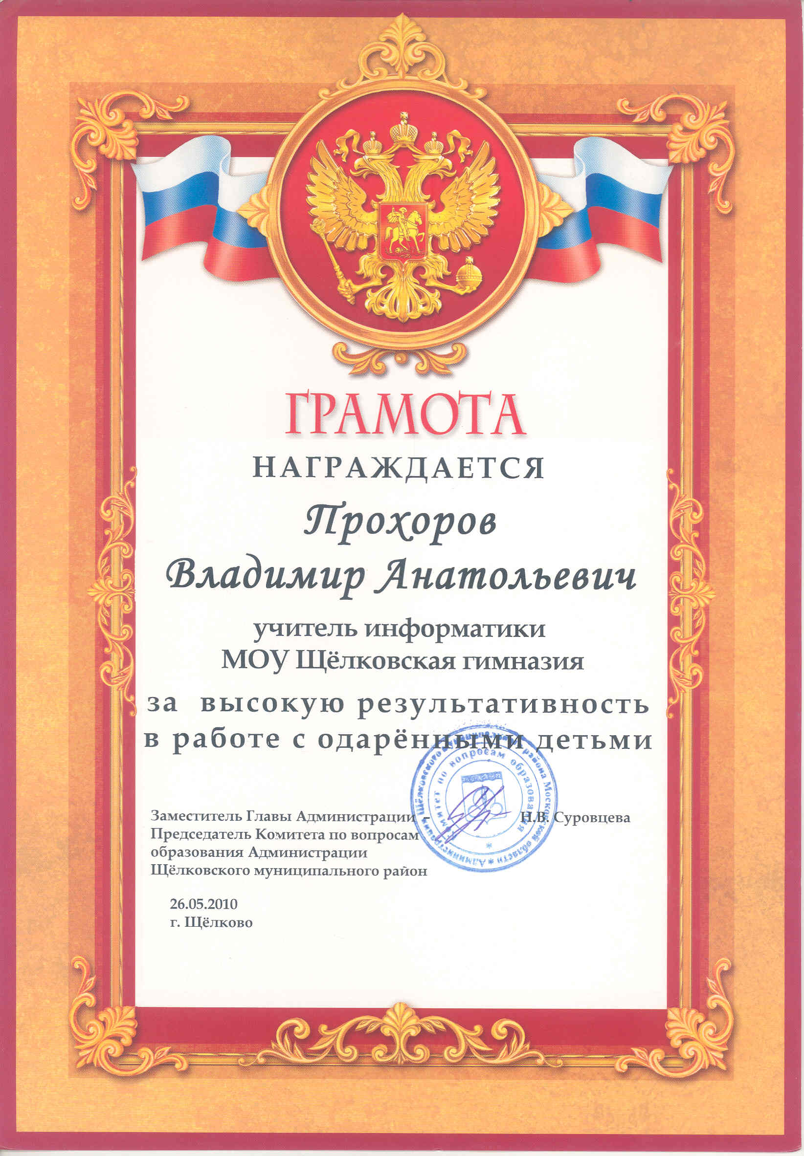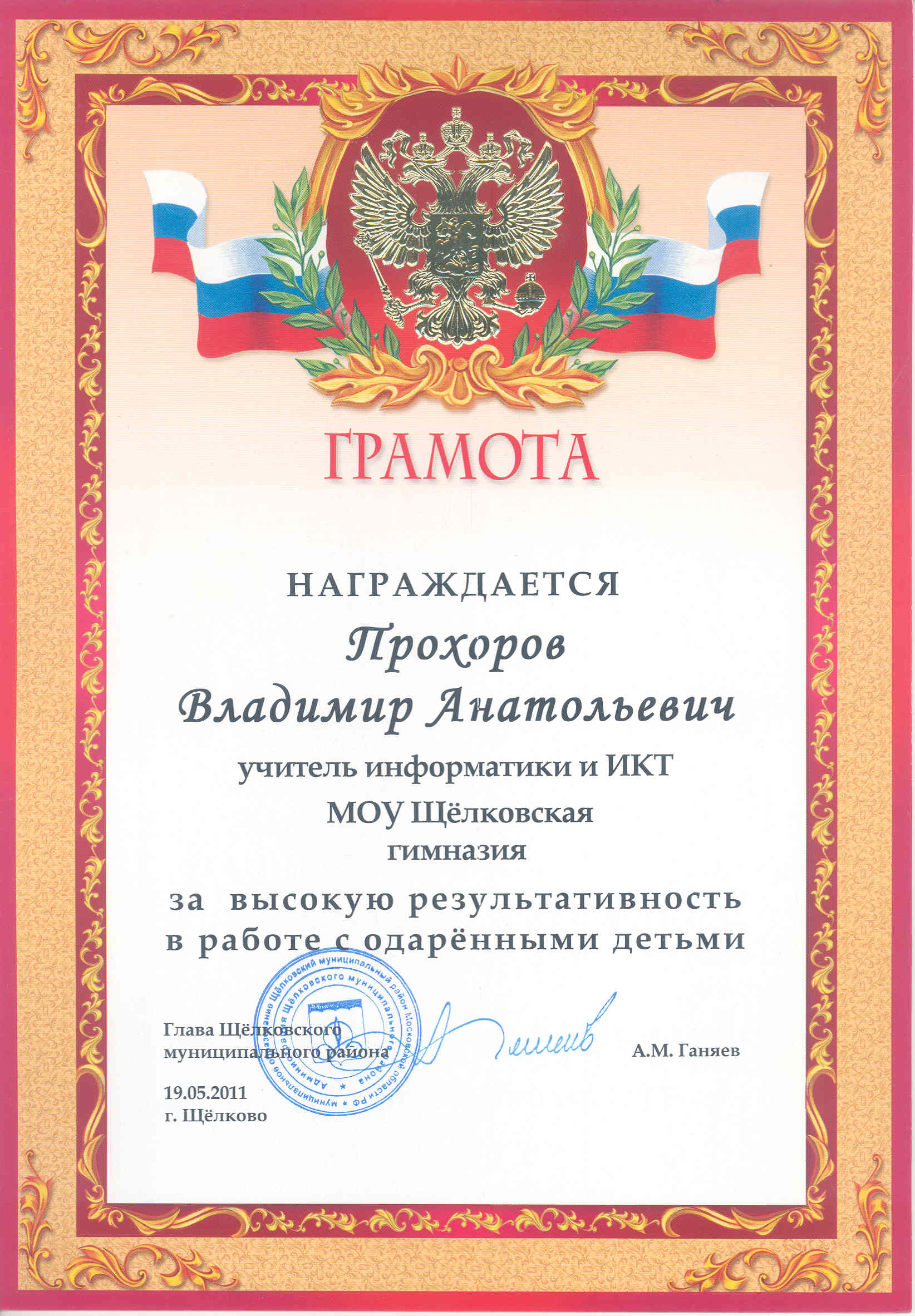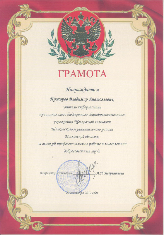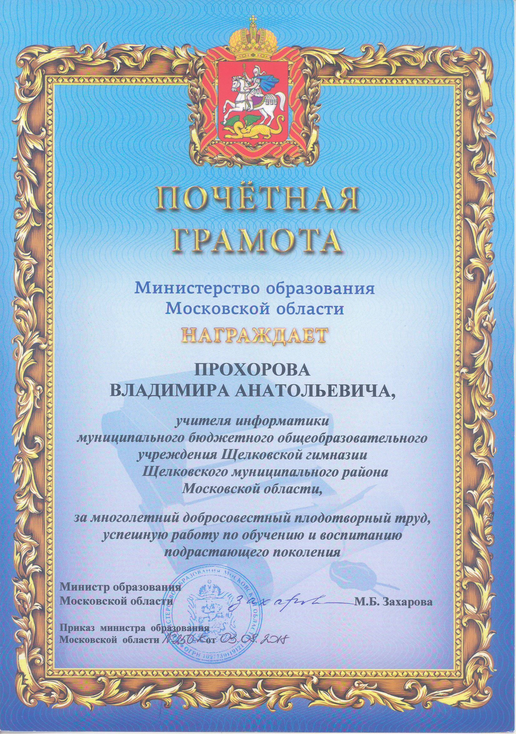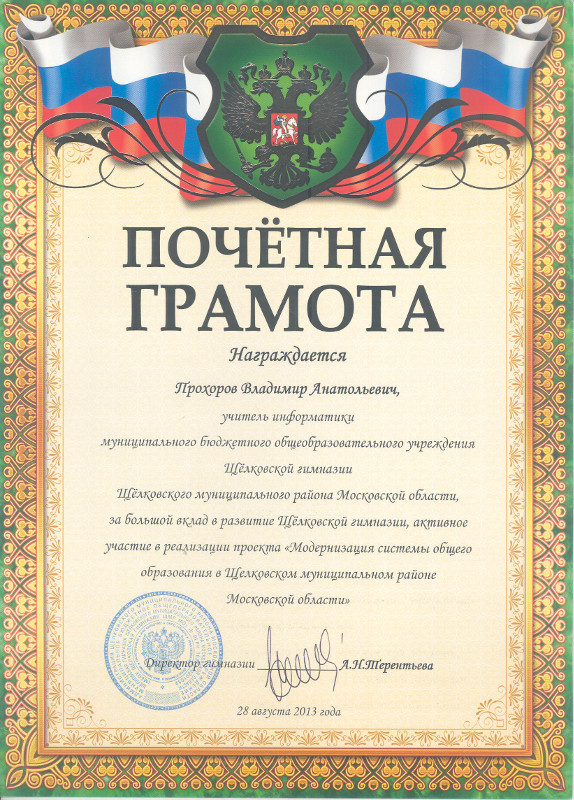 Грамота за большой вклад в развитие Щёлковской гимназии, активное участие в реализации проекта «Модернизация системы общего образования в Щёлковском муниципальном районе Московской области» |
