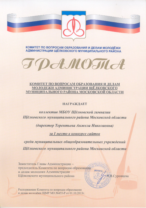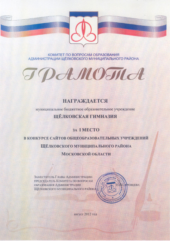 Грамота за 1 место в конкурсе сайтов среди общеобразовательных учреждений Щёлковского муниципального района Московской области |