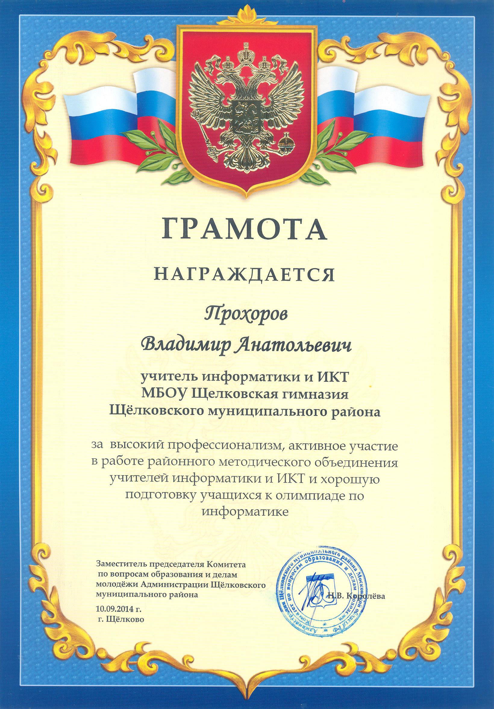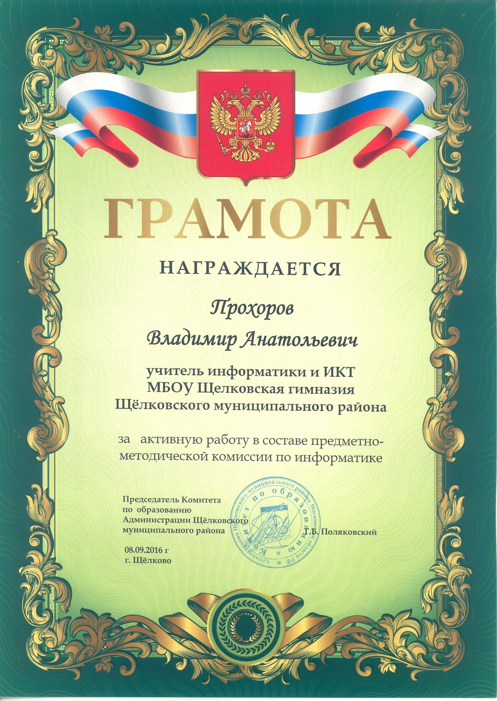 Грамота Комитета по образованию Администрации Щёлковского муниципального района М.О. за активную работу в составе предметно-методической комиссии по информатике |