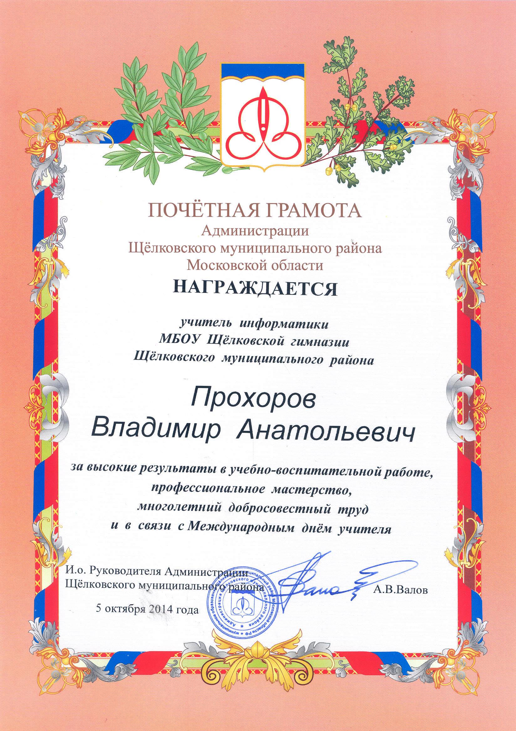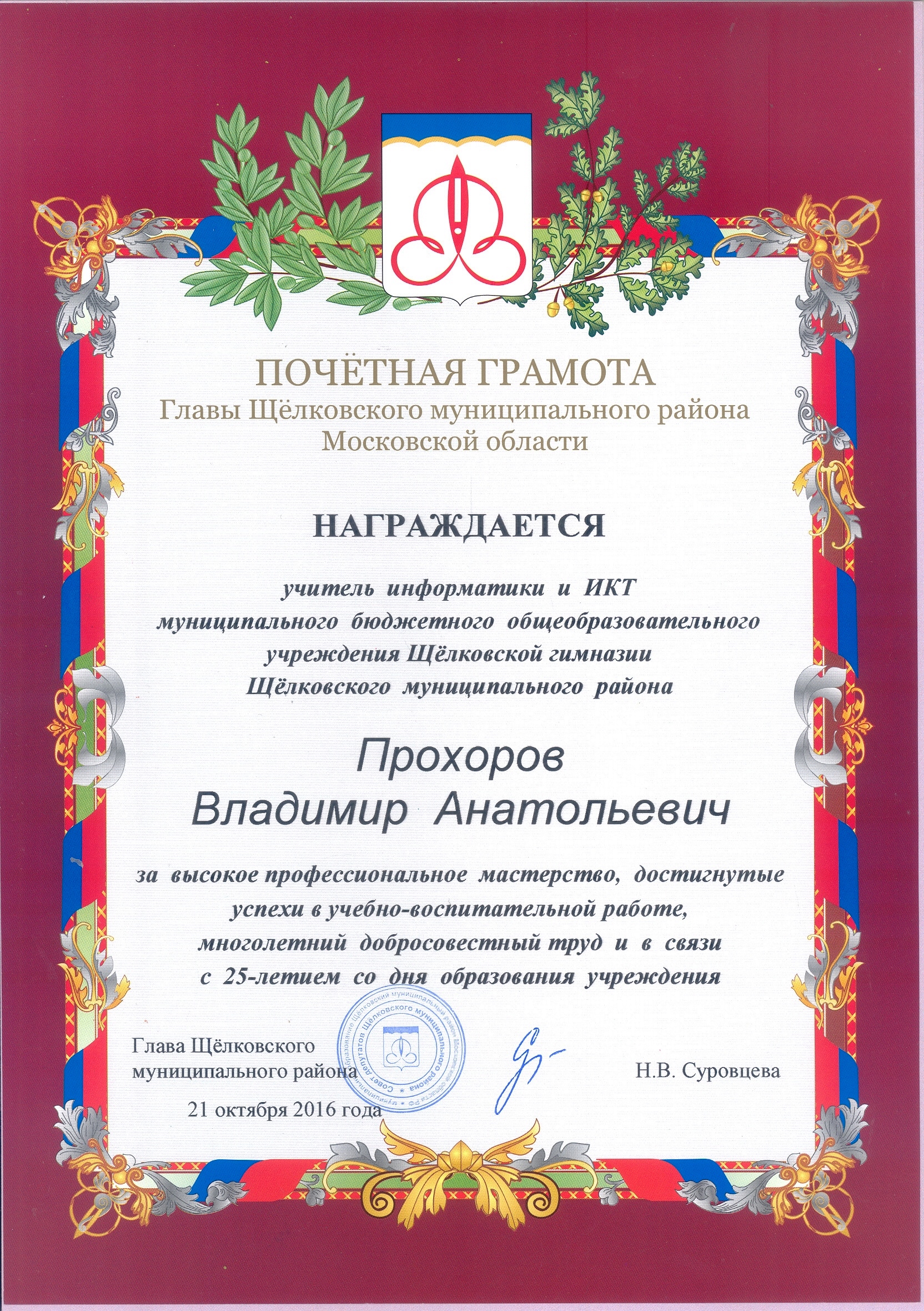 Почётная грамота Администрации Щёлковского муниципального района Московской области за высокие результаты в учебно-воспитательной работе, профессиональное мастерство, многолетний добросовестный труд и в связи с Международным днём учителя. |