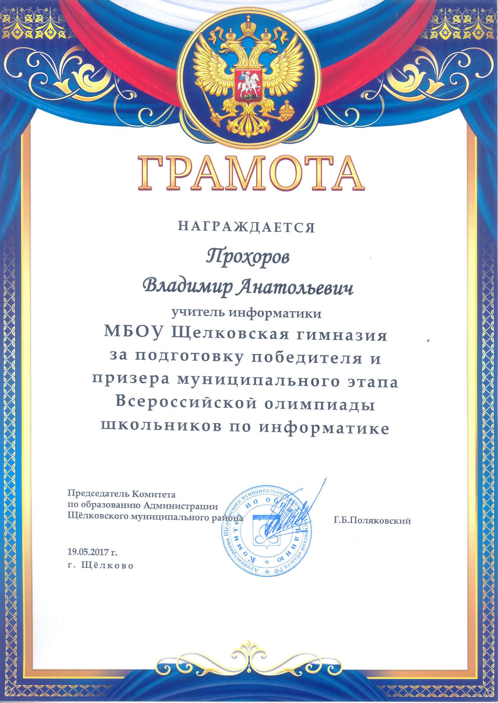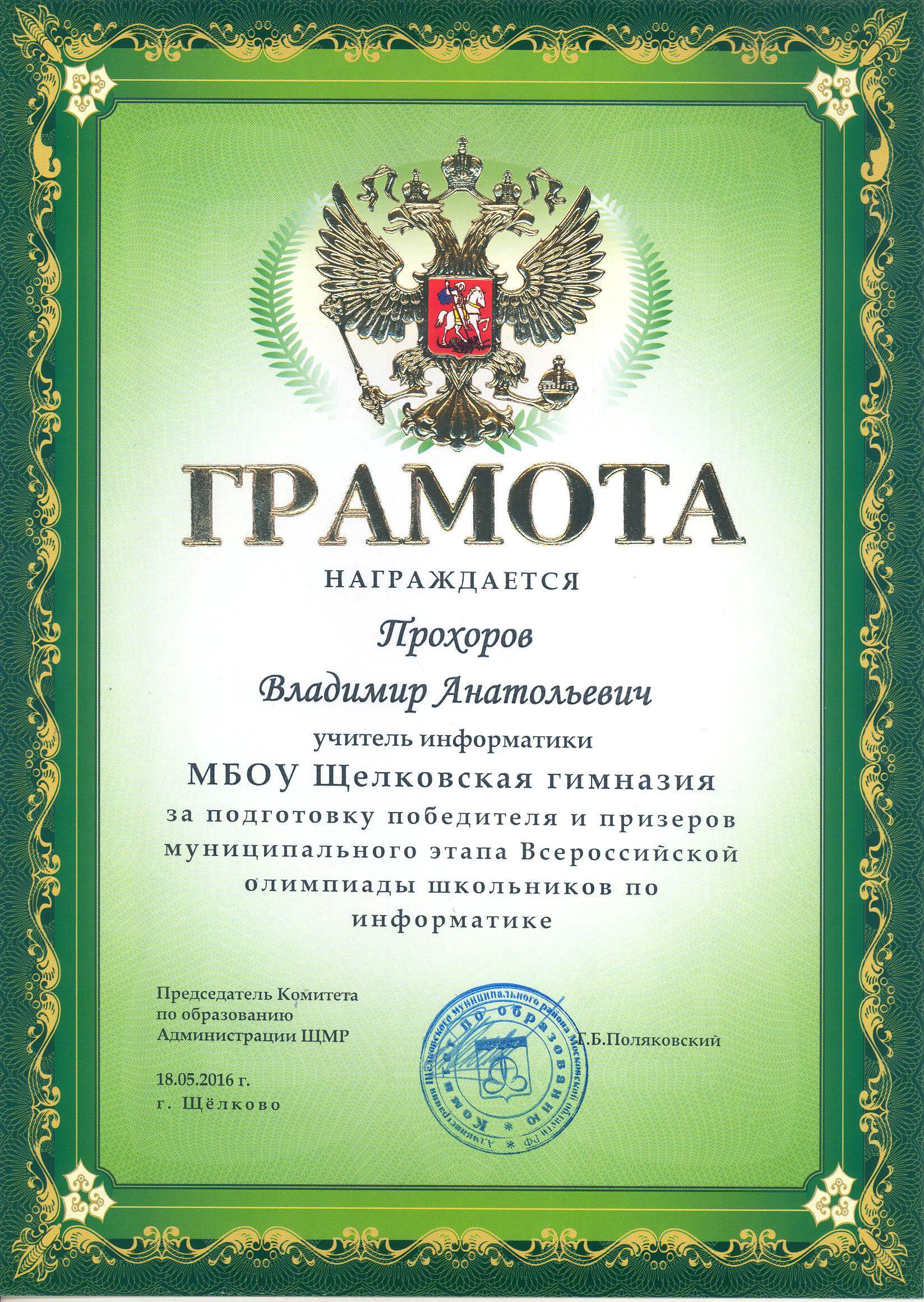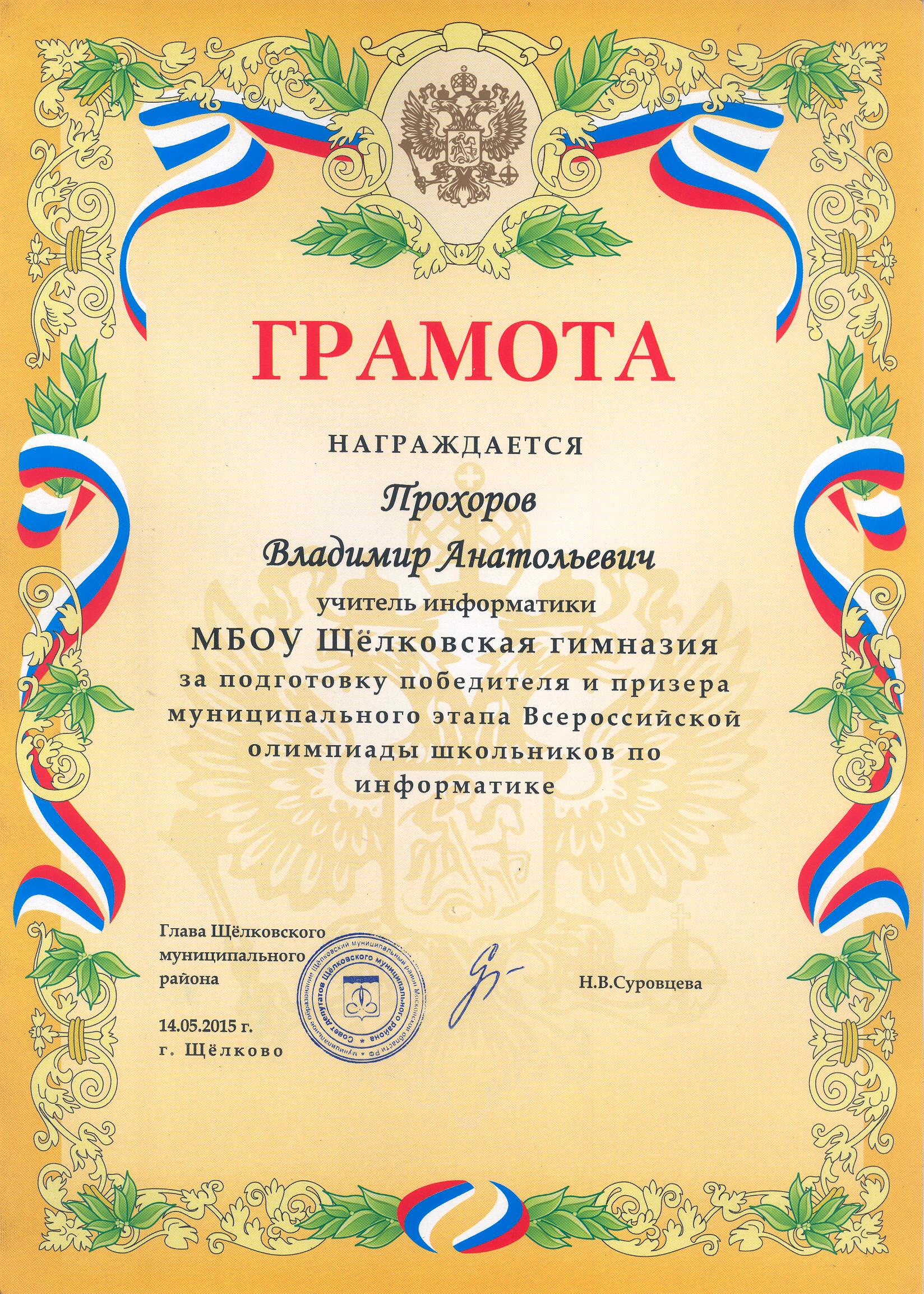 Грамота Комитета по образованию Администрации Щёлковского муниципального района М.О. за подготовку победителя и призёров муниципального этапа Всероссийской олимпиады школьников по информатике |