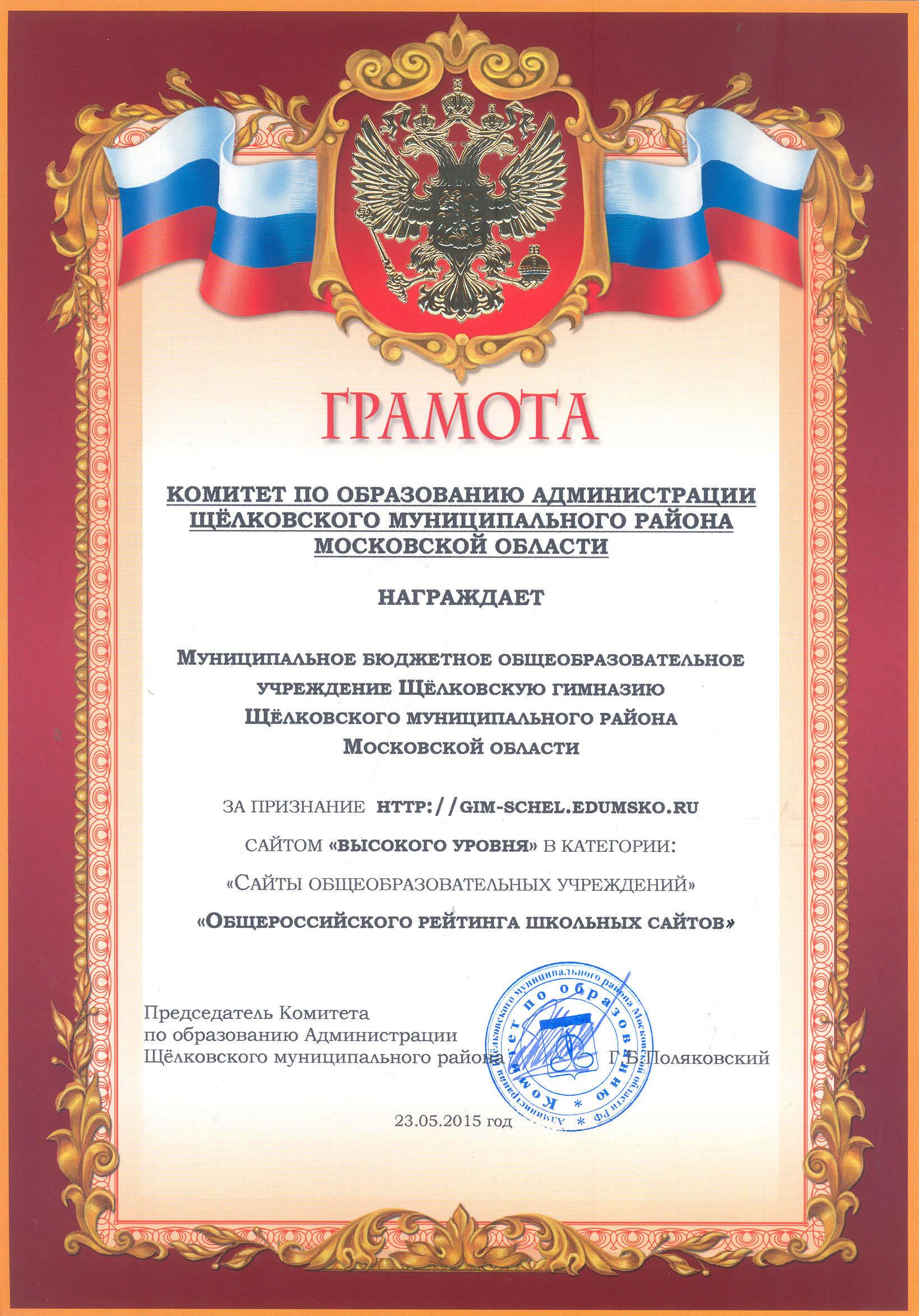 Грамота за признание http://gim-schel.edumsko.ru сайтом «высокого» уровня в категории: «Сайты общеобразовательных учреждений» «Общероссийского рейтинга школьных сайтов» |