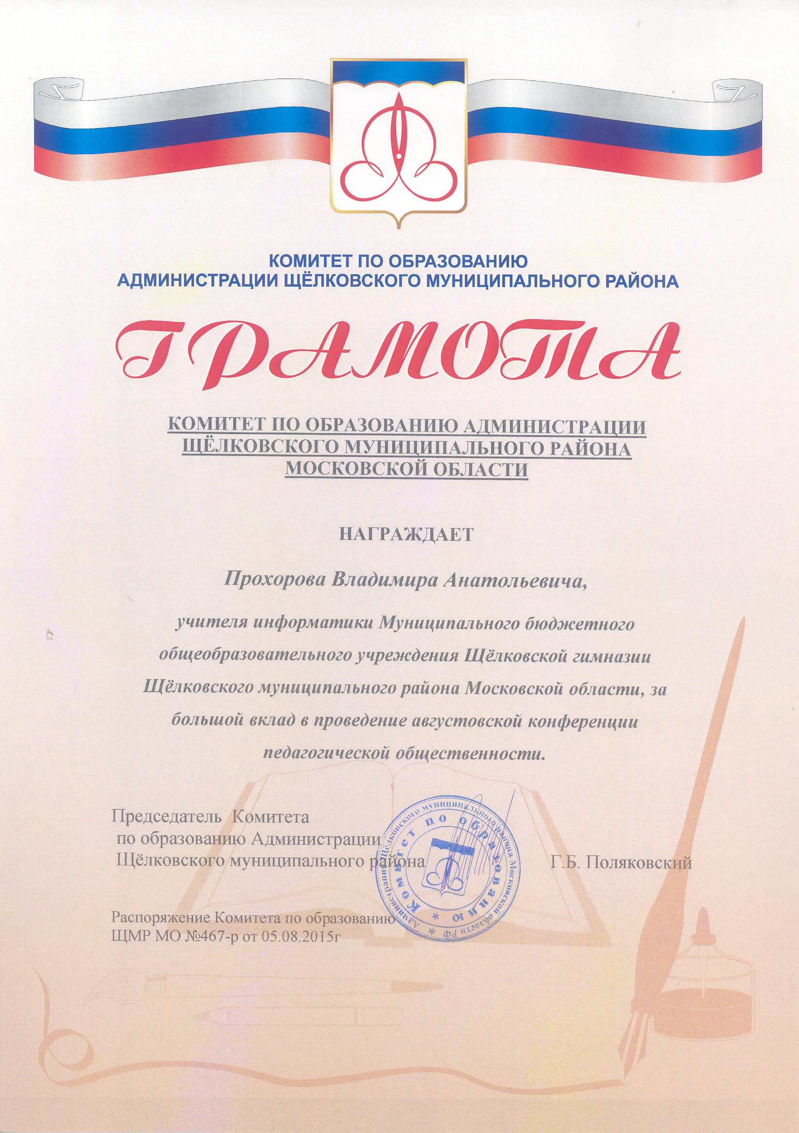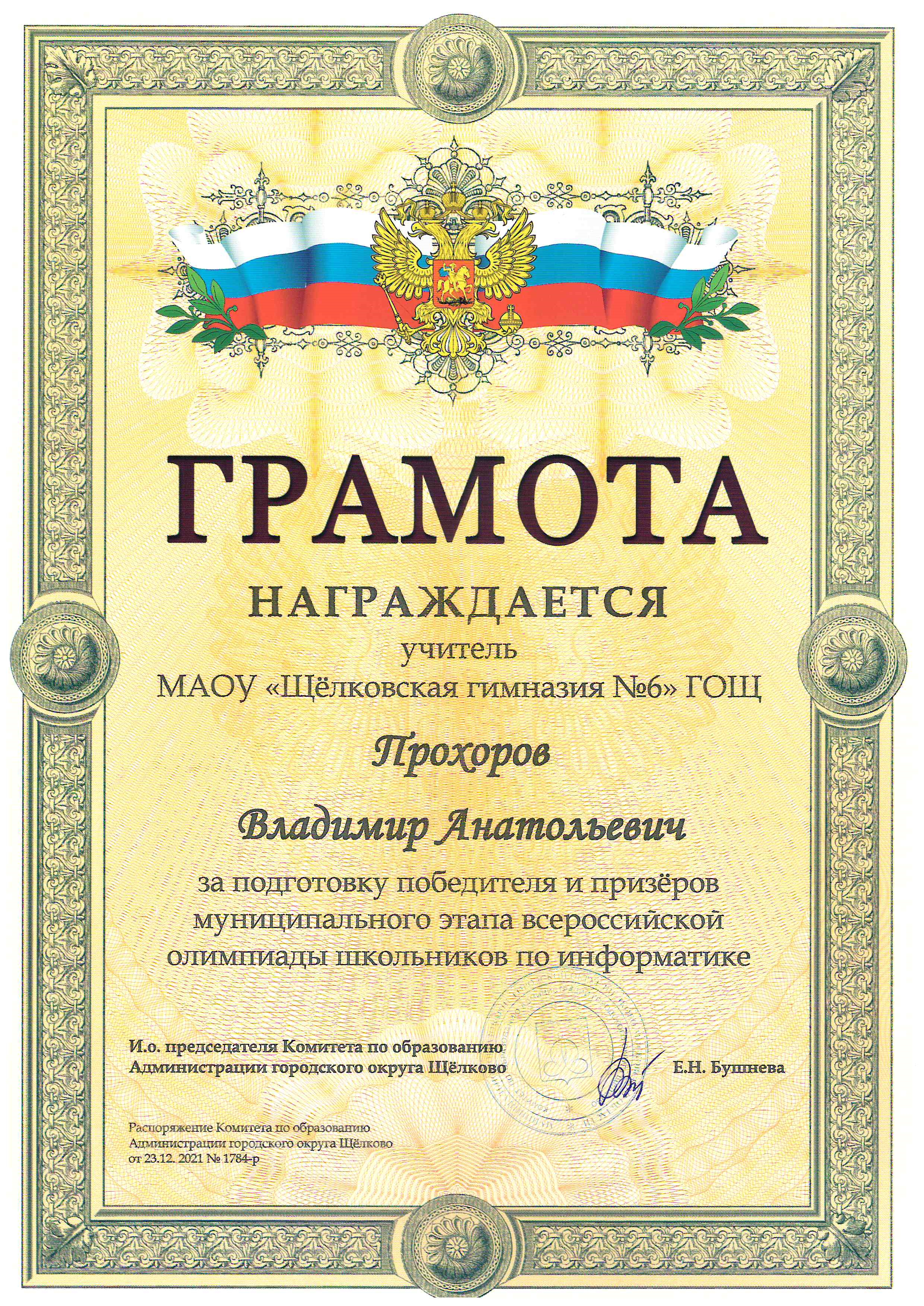 Грамота Комитета по образованию Администрации Щёлковского муниципального района М.О. за подготовку победителей муниципального этапа Всероссийской олимпиады школьников по информатике |
