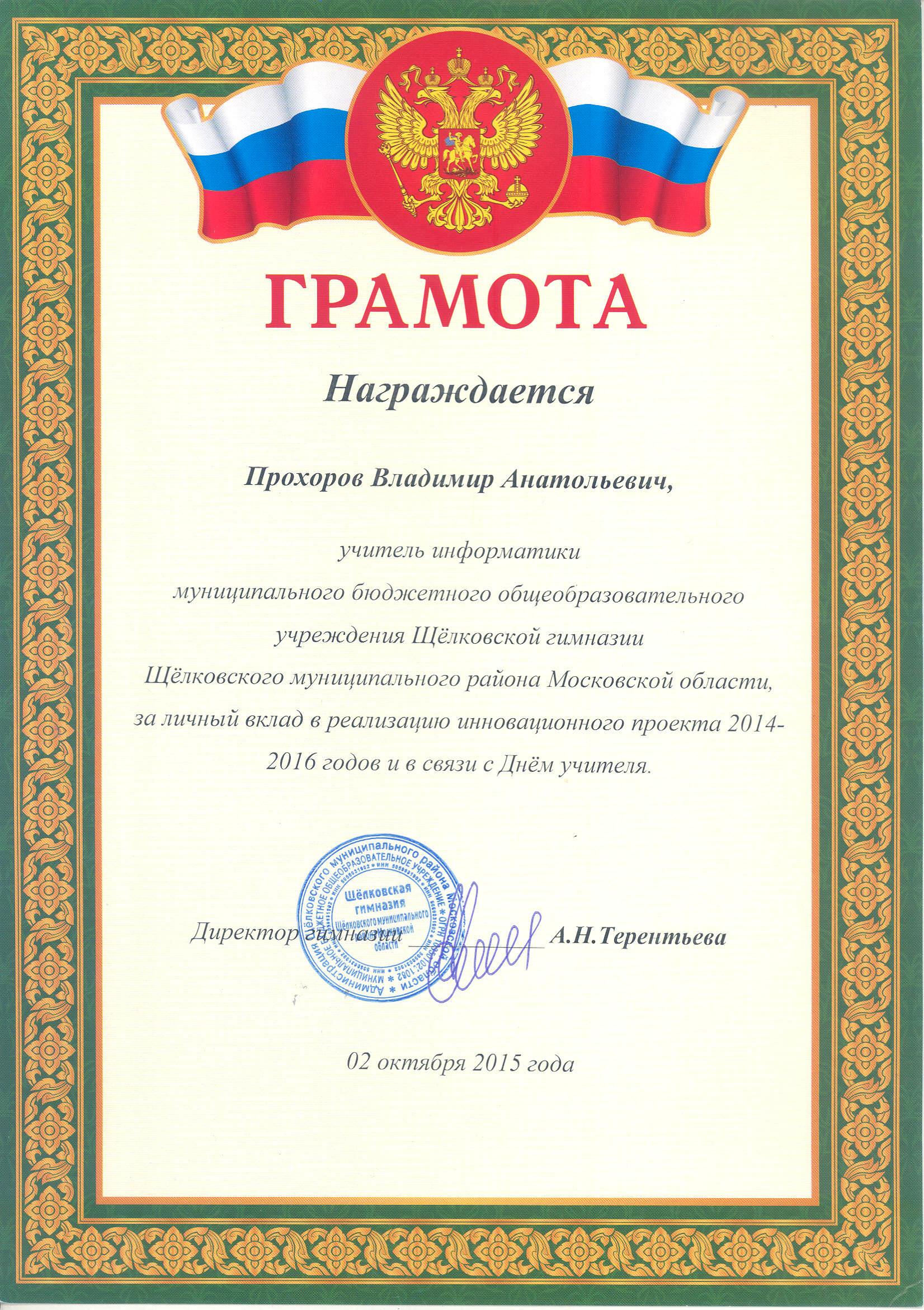 Грамота за личный вклад в реализацию инновационного проекта 2014-2016 годов и в связи с Днём учителя |