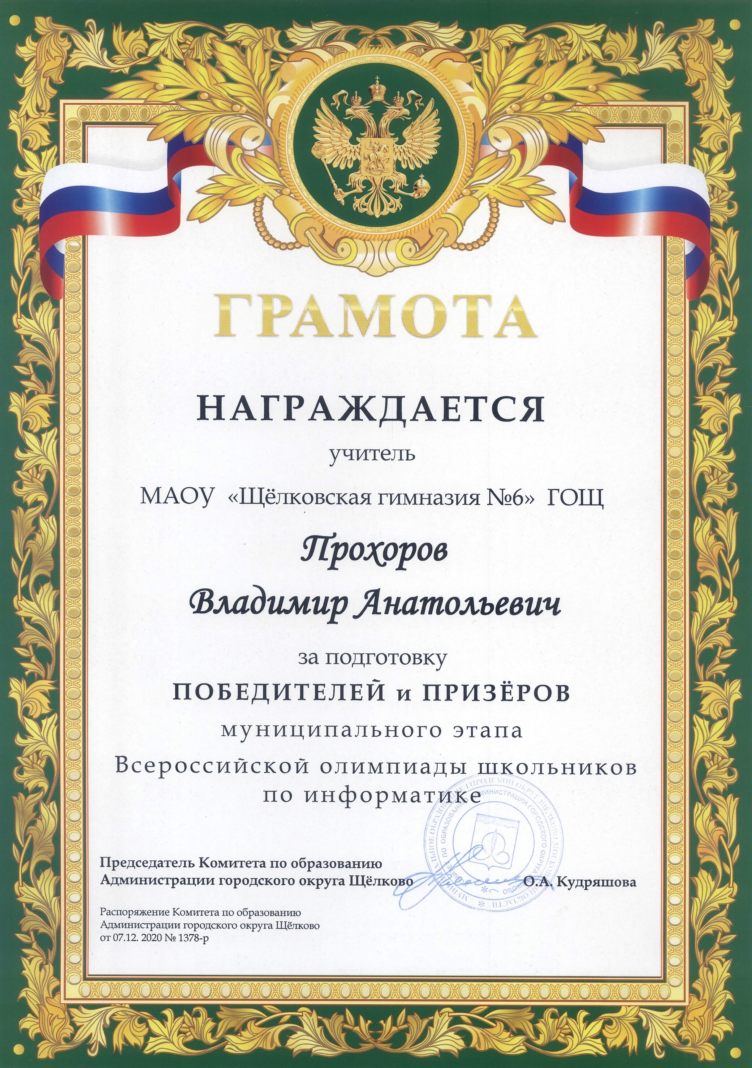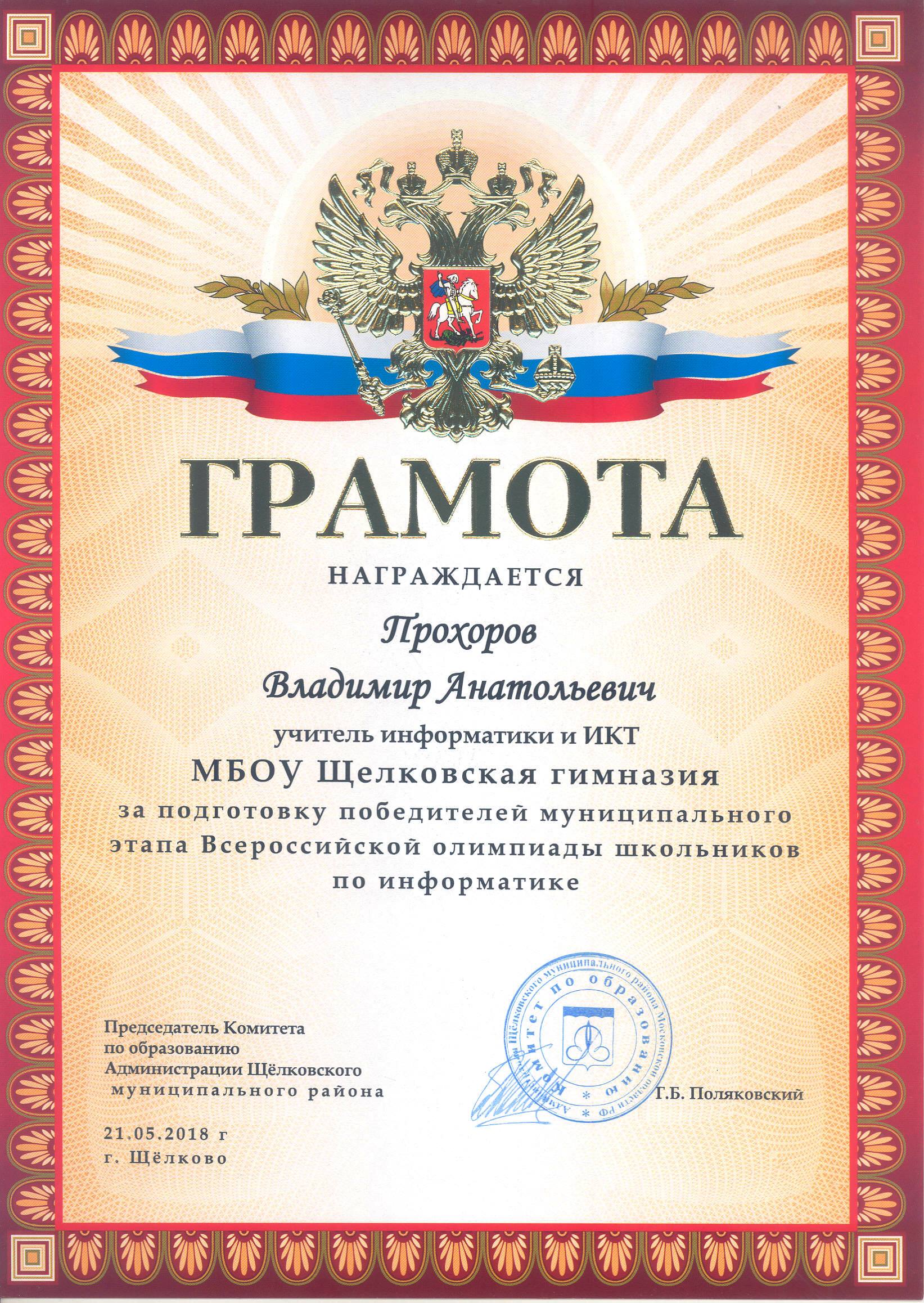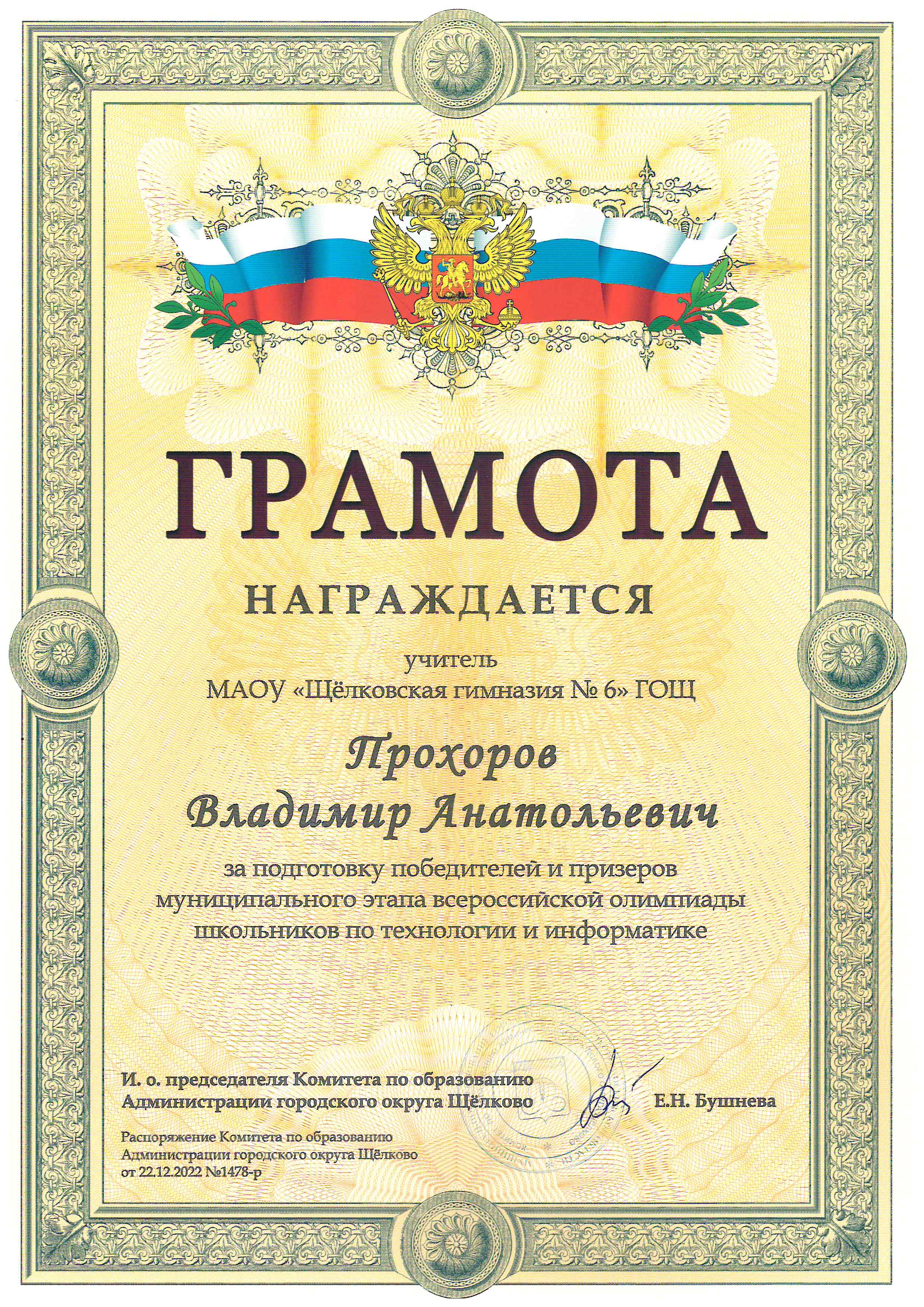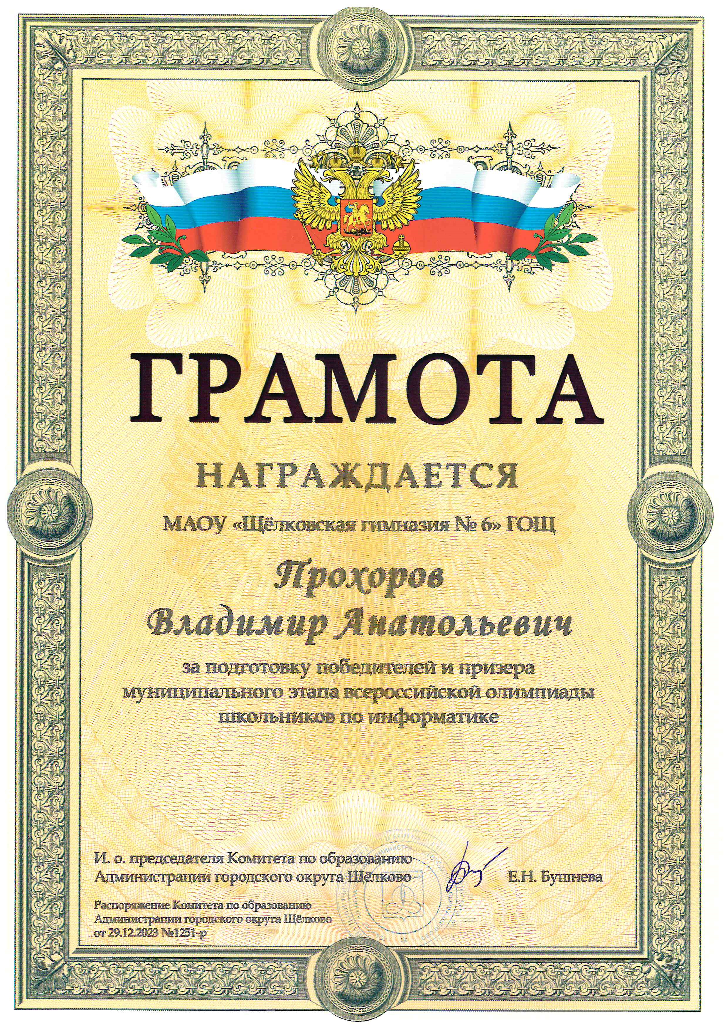 Грамота Комитета по образованию Администрации городского округа Щёлково за подготовку победителей и призёров муниципального этапа Всероссийской олимпиады школьников по информатике |