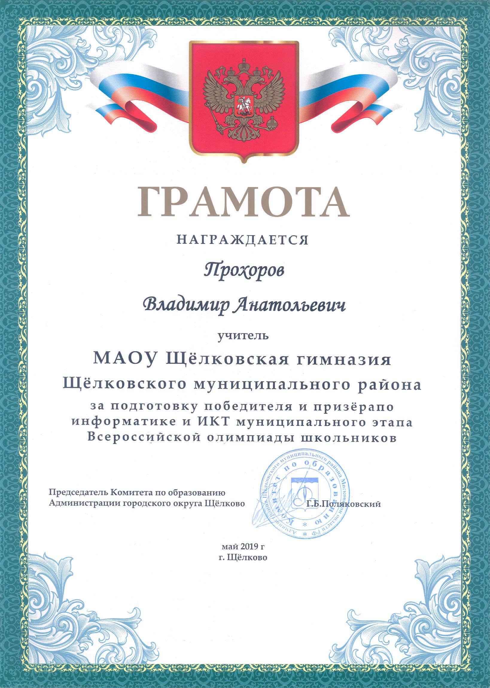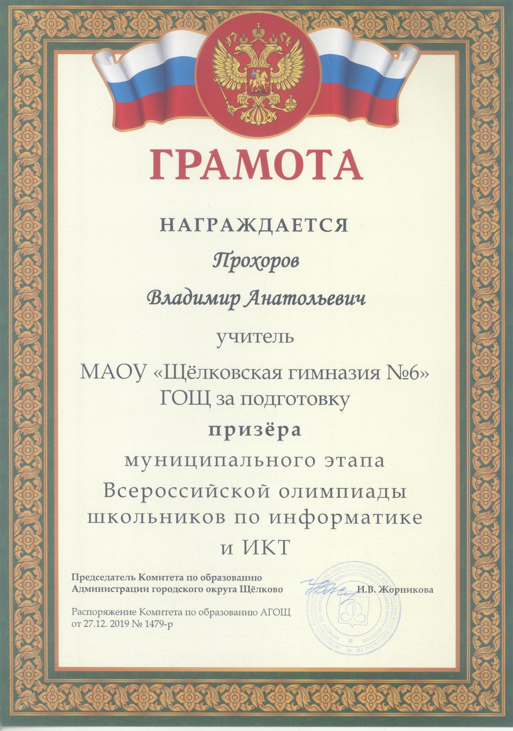 Грамота Комитета по образованию Администрации городского округа Щёлково за подготовку победителя и призёра по информатике и ИКТ муниципального этапа Всероссийской олимпиады школьников |