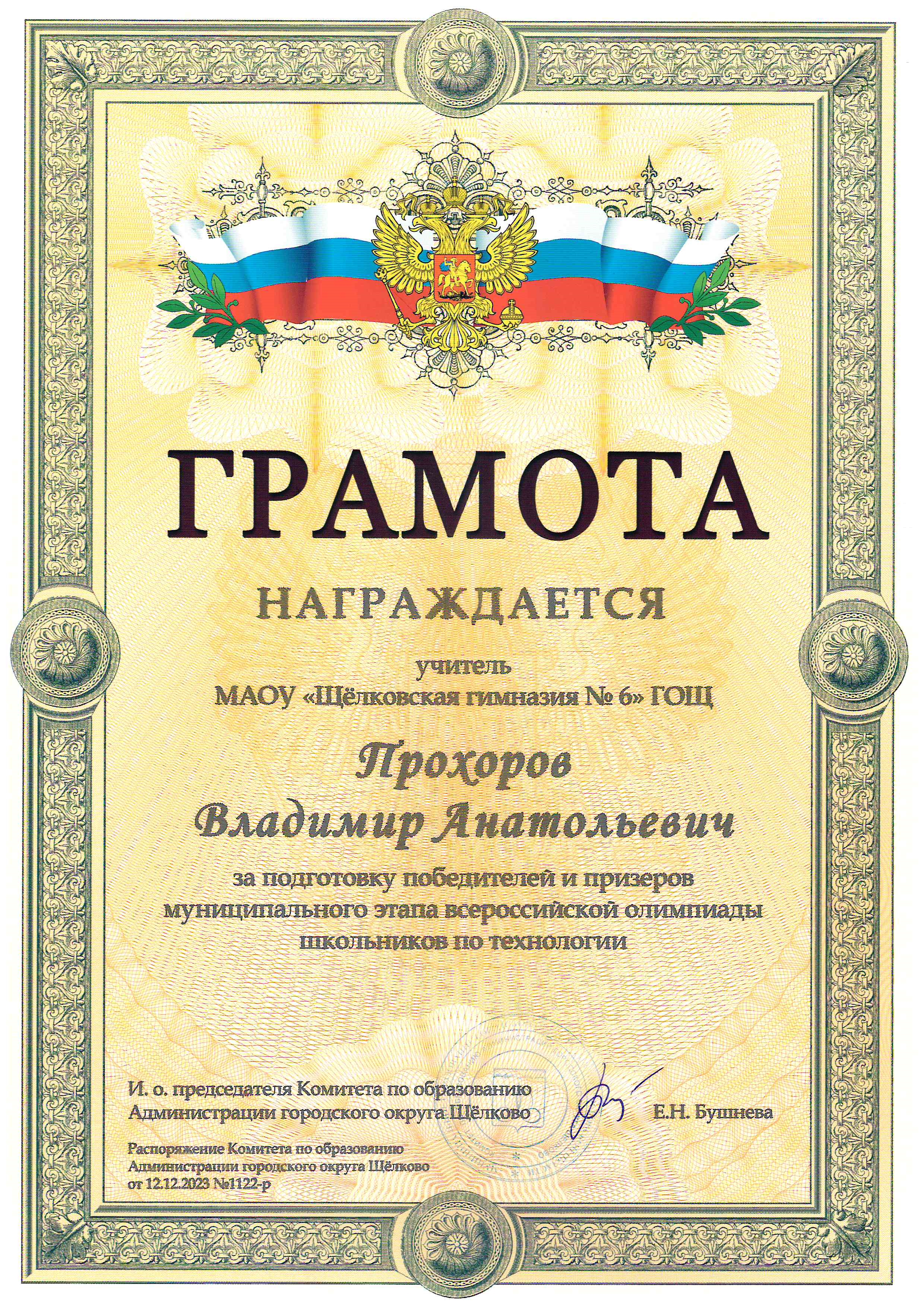 Грамота Комитета по образованию Администрации городского округа Щёлково за подготовку победителей и призёров муниципального этапа Всероссийской олимпиады школьников по технологии и информатике |
