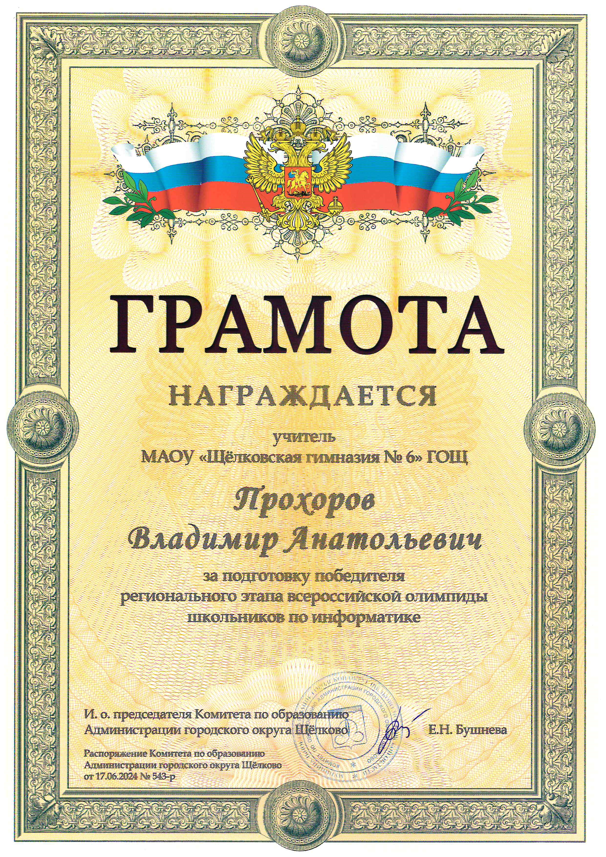 Грамота Комитета по образованию Администрации городского округа Щёлково за подготовку победителя регионального этапа Всероссийской олимпиады школьников по информатике |