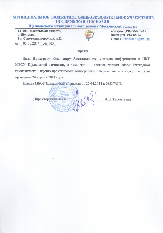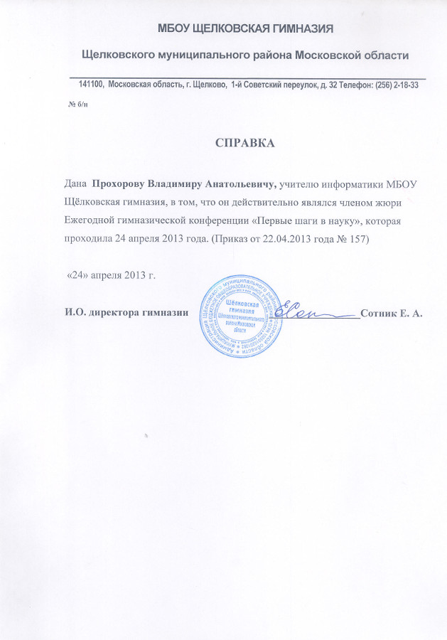 Член жюри Ежегодной гимназической конференции «Первые шаги в науку» |