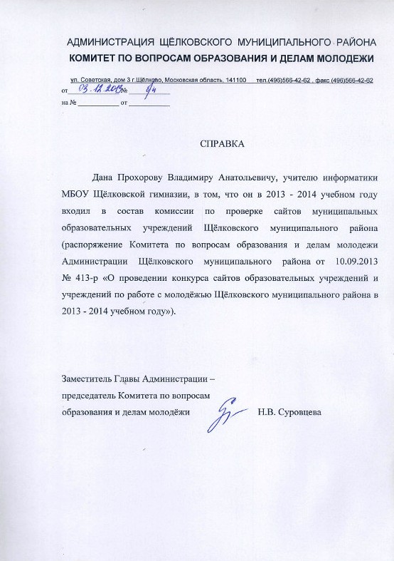 Член комиссии по проверке сайтов муниципальных образовательных учреждений Щёлковского муниципального района |